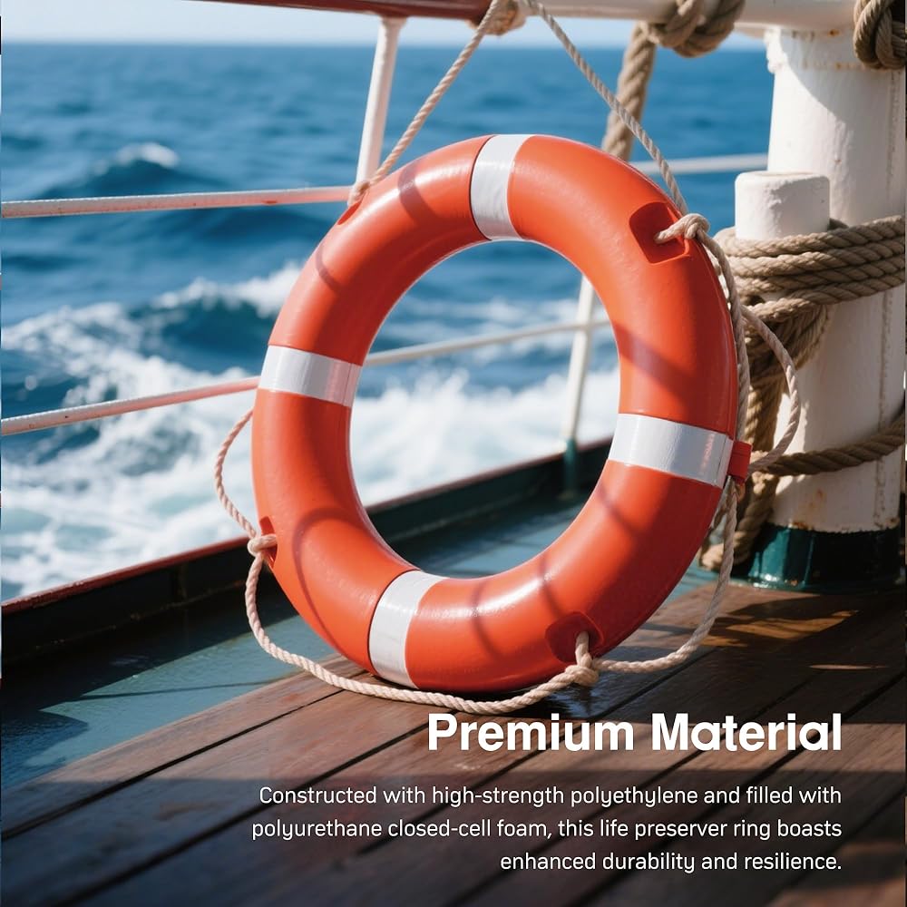 【Durable Polyethylene & Foam Core】 Crafted from high-strength polyethylene shell and filled with polyurethane closed-cell foam, this Coast Guard style life ring buoy withstands extreme weather, impacts, and seawater corrosion. The marine-grade build ensures long-lasting durability for boats, docks, and waterfront safety.
