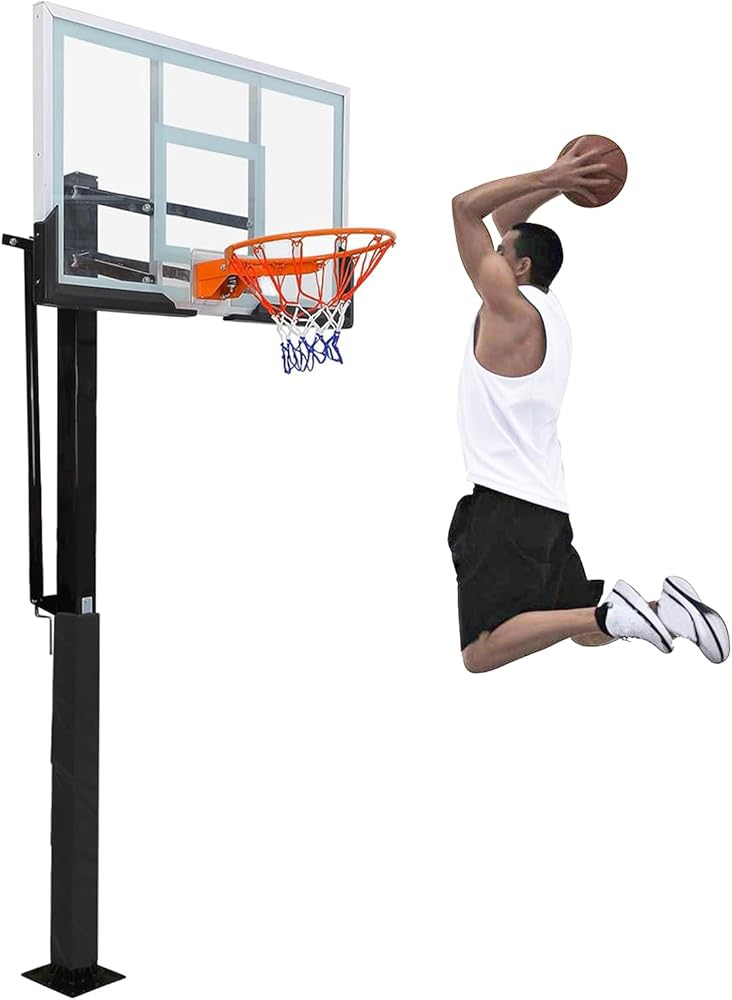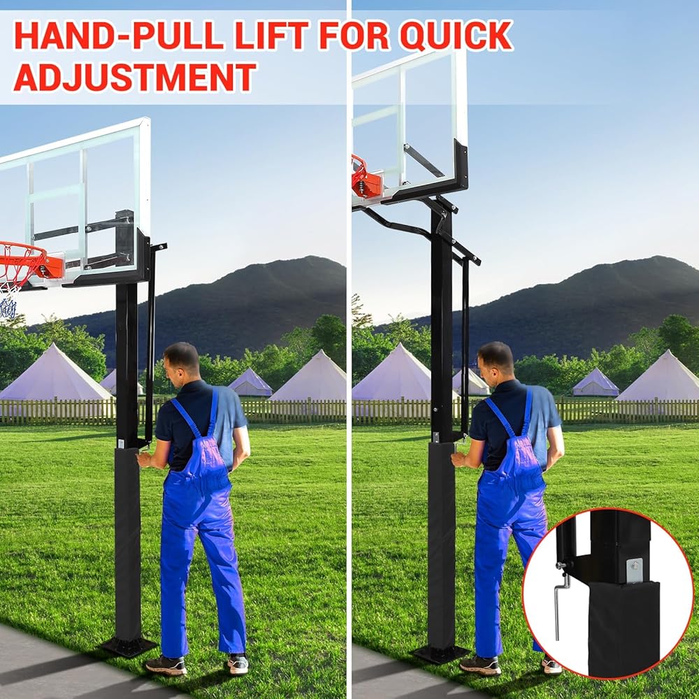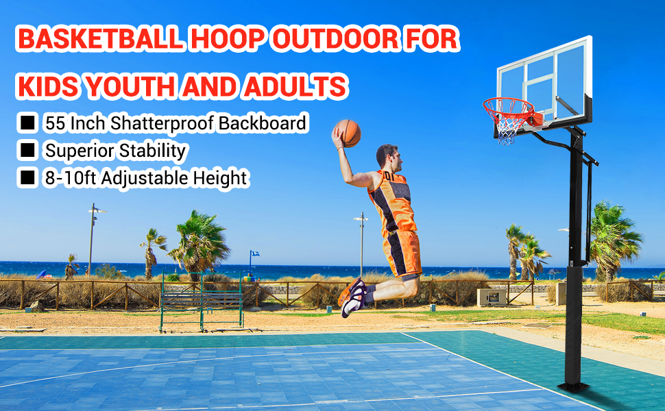 طوق كرة سلة قابل للتعديل على الأرض مقاس 55 بوصة مع لوح خلفي من الزجاج المقسى، ارتفاع 8-10 أقدام، قاعدة مزدوجة الخيار آمنة للعائلة، نظام خارجي مقاوم للصدأ للفناء الخلفي والممر والملعب