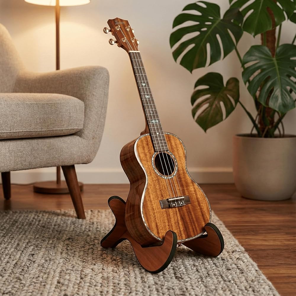 Elevate your ukulele's presentation with this elegantly crafted wooden stand holder. The stand features a beautiful wood grain finish with contrasting dark edges that add a sophisticated touch to any room. Its thoughtfully engineered design provides stable support while displaying your cherished instrument at an optimal angle. The curved elements and precise cutouts not only serve a functional purpose but also create an artistic silhouette that complements your ukulele. Perfect for both storage and display, this stand keeps your instrument readily accessible while protecting it from potential damage. The solid construction ensures durability, while the smooth, finished surfaces prevent any scratching to your instrument. Whether placed in your home studio, practice room, or living space, this stand combines practicality with aesthetic appeal. Its compact footprint makes it ideal for any setting where you want to showcase your ukulele while keeping it within easy reach.
