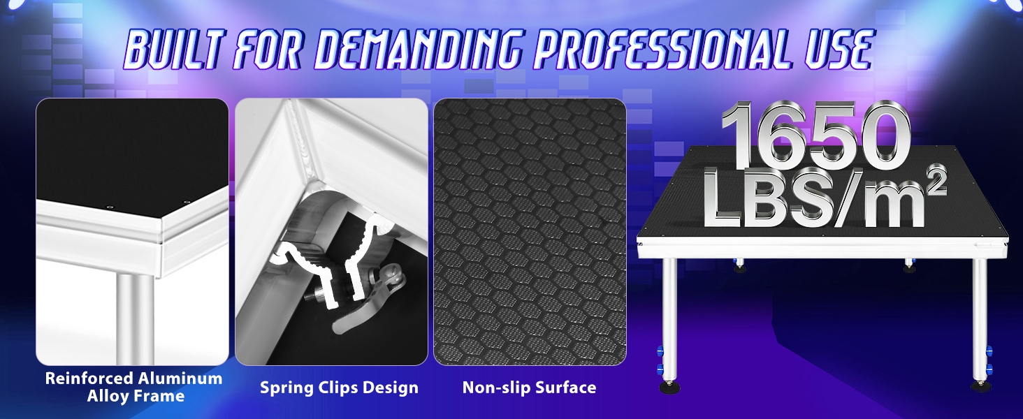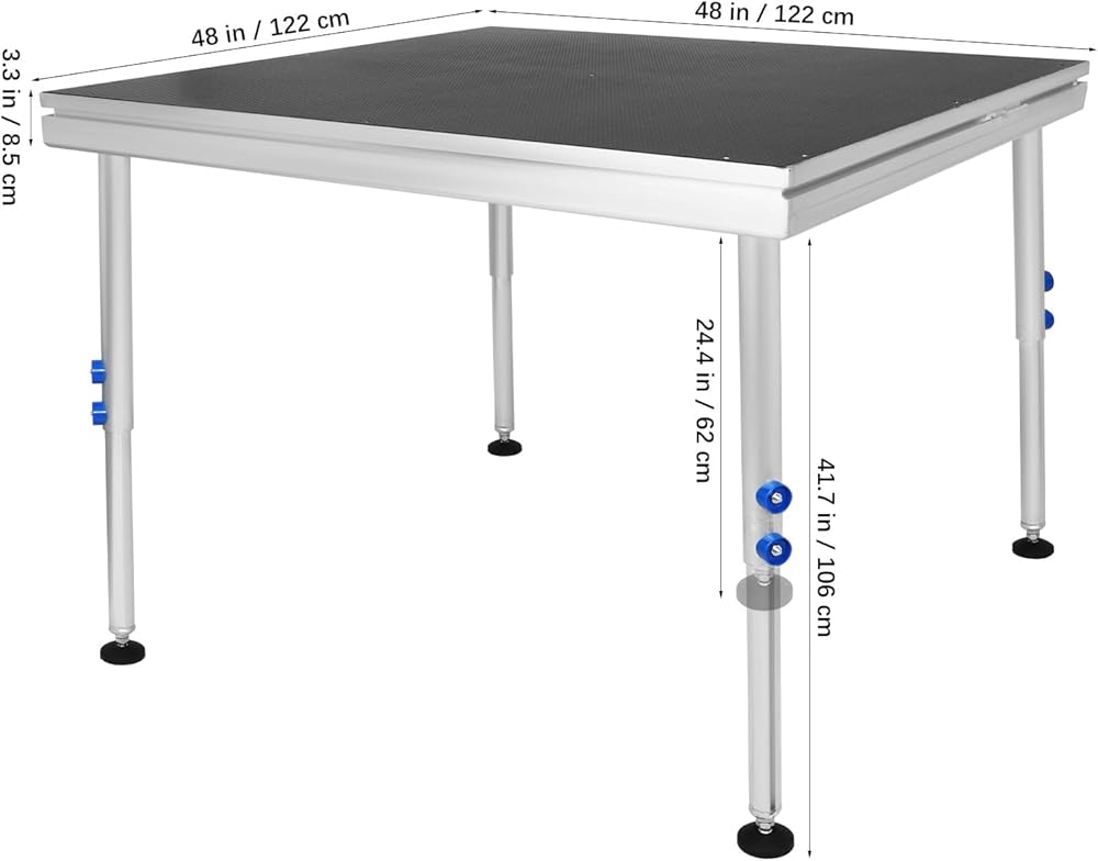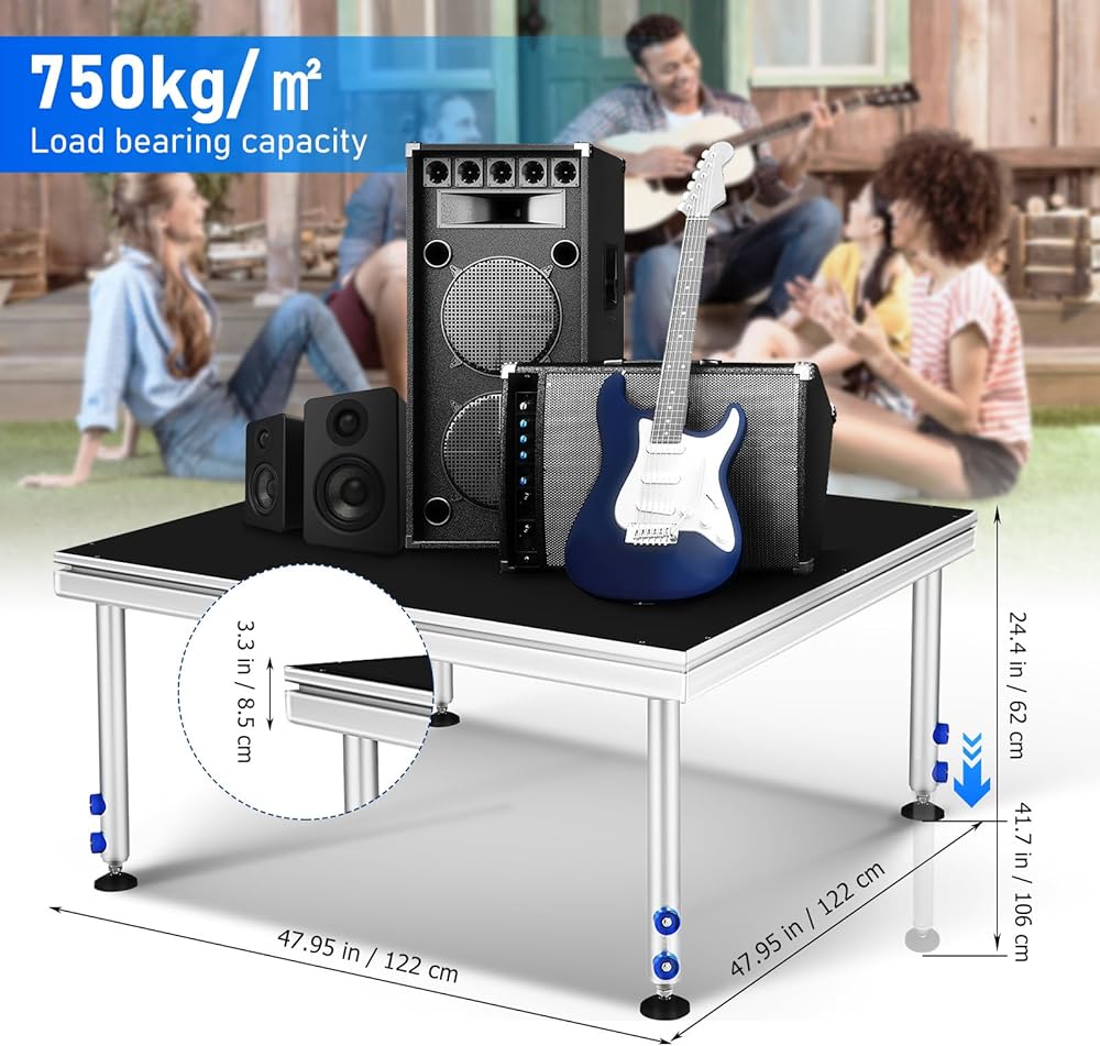 【البناء الثقيل 】 سطح المسرح هذا مقاس 4x4 قدم مصنوع من مواد متميزة ليظل ثابتًا حتى تحت الأحمال الثقيلة. سواء تم استخدامه كمنصة للموسيقيين أو منصة للخطابات، فإنه يضمن السلامة المطلقة. يحافظ السطح المضاد للانزلاق على أمان المعدات، حتى أثناء الأداء الديناميكي، مما يمنع الحركة أو الحوادث غير المرغوب فيها