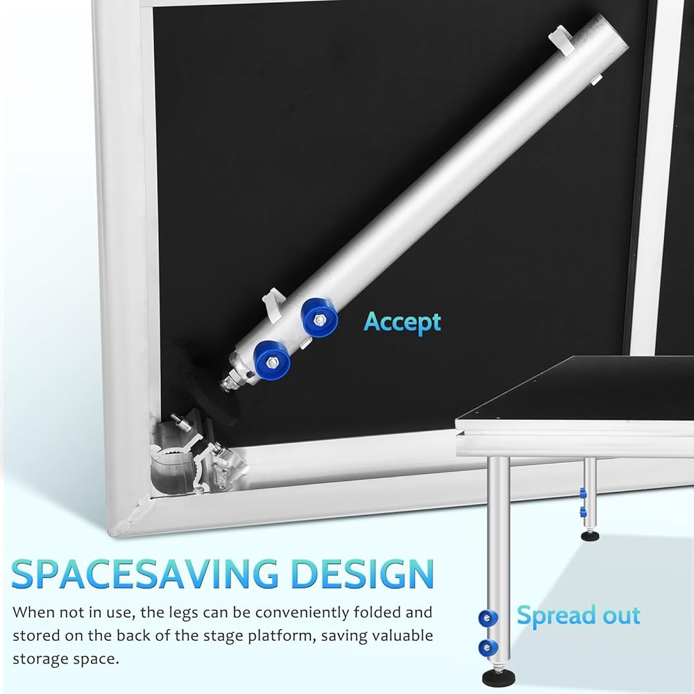 【أرجل قابلة للطي وإمكانية النقل】مصممة للتنقل الحقيقي، تم بناء المسرح بأربعة أرجل قابلة للطي بالكامل، مما يجعل الإعداد والإزالة أسهل من أي وقت مضى. تضمن هذه الميزة الفريدة بقاء منصة المسرح المحمولة للأحداث مدمجة للنقل والتخزين، مع الحفاظ على هيكل قوي ومتين للعروض بجميع أنواعها