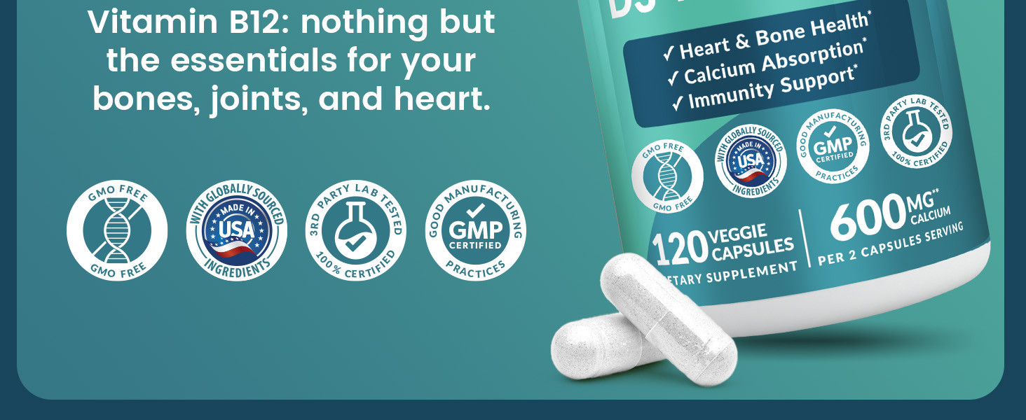 كيف يعمل - يدعم فيتامين د3 امتصاص الكالسيوم، ويدعم فيتامين ك2 التوزيع السليم للكالسيوم، ويدعم الكالسيوم وظيفة العظام والعضلات بينما يدعم فيتامين ب12 وظيفة الأعصاب.