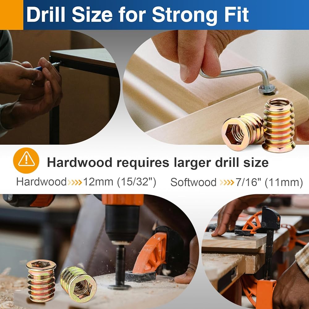 - سهولة التركيب باستخدام دليل المثقاب: حجم المثقاب الموصى به: الخشب اللين: 7/16 بوصة (11 ملم) الخشب الصلب: 12 ملم (15/32 بوصة) تجنب الثقوب الضيقة في الخشب الصلب لضمان التثبيت السلس. قم بالقيادة باستخدام الأداة السداسية المتضمنة.