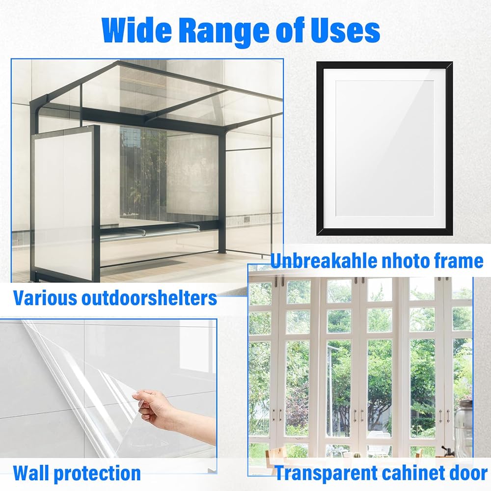 • Crystal Clarity:High-quality cast plexiglass offers distortion-free transparency, with smooth, burr-free edges—ideal as a substitute for cut-to-size glass panels. Plexiglass water- and oil-resistant surface ensures long-lasting clear visibility for displays, plastic picture frames, or DIY decorations. Roll packaging and size changes don't affect its clarity, keeping protected items'original look intact.