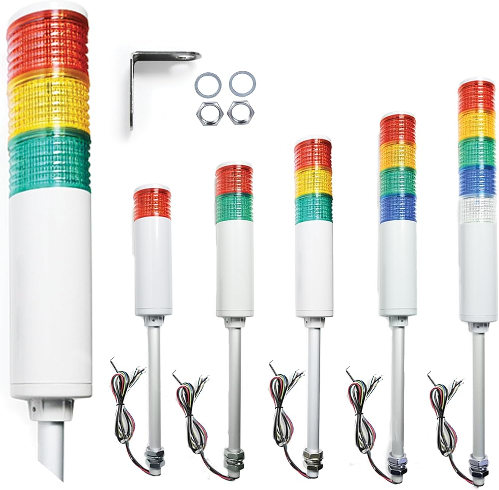 • 5 مصابيح LED لبرج أندون، أحمر / كهرماني / أخضر / أزرق / شفاف، ثابت / وامض، عمود معدني ملولب 10 بوصة، دعامة زاوية قائمة وصواميل تثبيت. ضوء أسطواني بقطر 56 مم (2 ¼ بوصة) مع عمود بقطر 18 مم