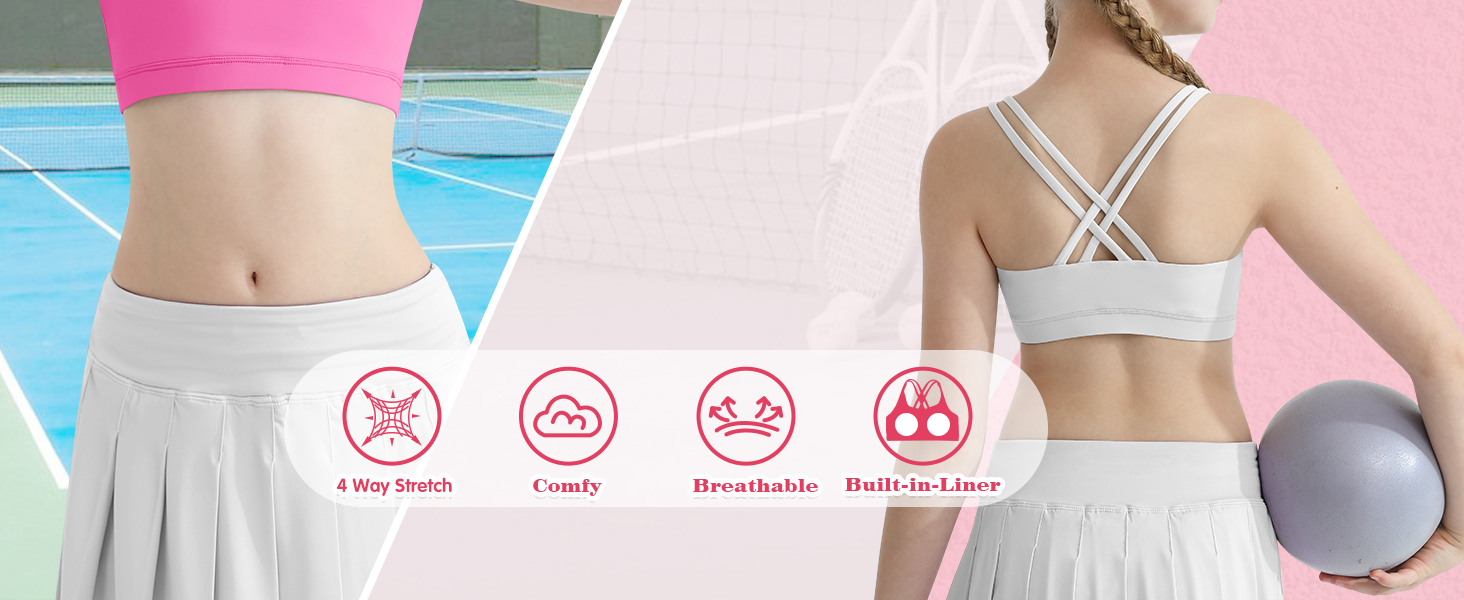 أقصى قدر من الدعم والمتانة - مصنوع من 80% نايلون و20% ألياف لدنة من أجل تمدد فائق وتهوية وارتداء طويل الأمد. يعزز تصميم Racerback الثبات أثناء الأنشطة عالية التأثير مثل الرياضة والرقص وكرة القدم والجري أو التدريبات الرياضية.