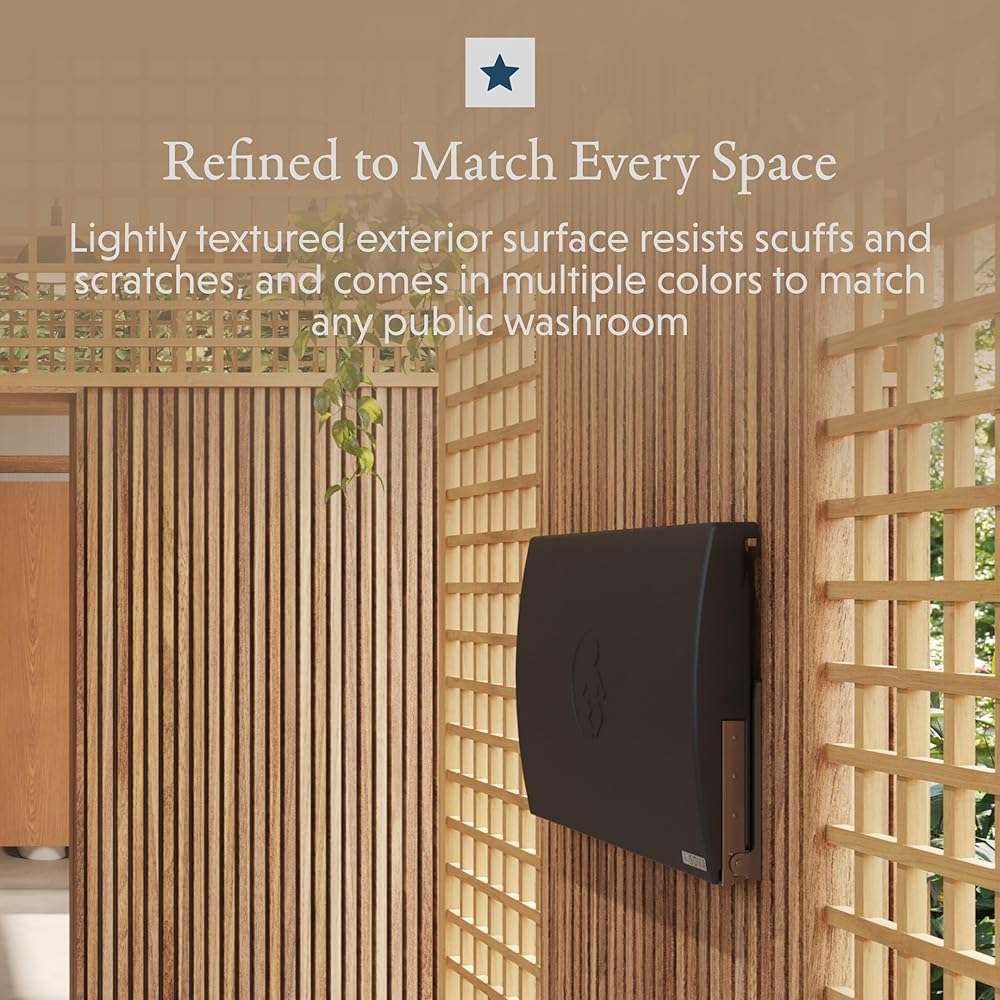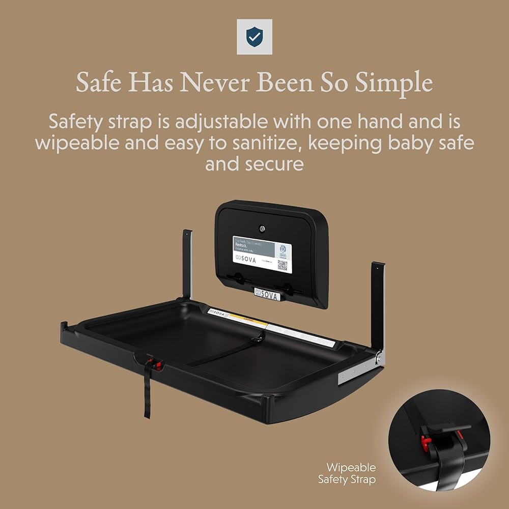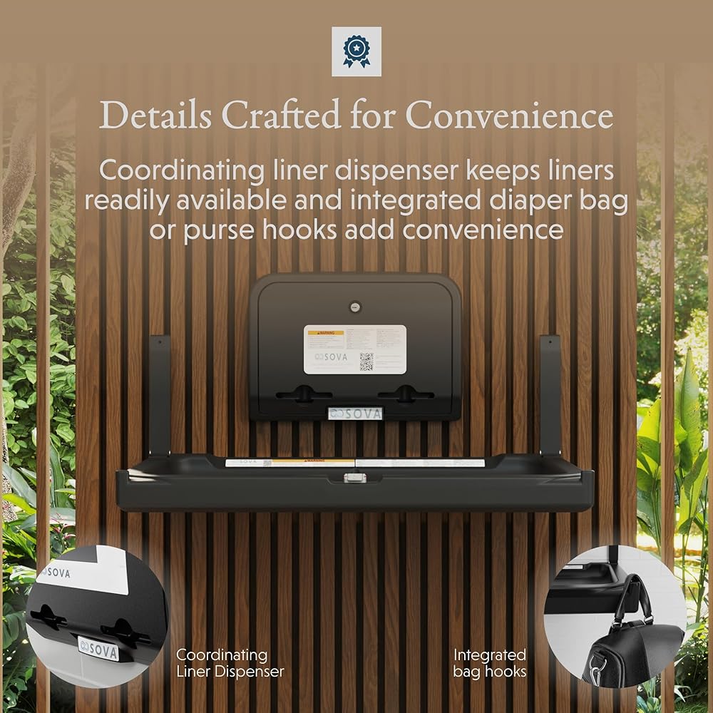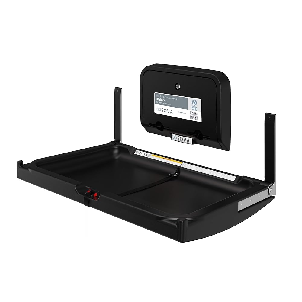 Simplify ADA compliance with the Sova Element changing station. Its modular design and intuitive installation template ensure easy, one-person setup, supporting compliance and enhanced guest satisfaction. Crafted from lightweight, durable high-density polyethylene, the Element features a lightly textured exterior available in multiple colors to complement diverse public washrooms and commercial spaces.Its smooth, concave changing surface comfortably accommodates both babies and toddlers, providing essential safety through an integrated polyurethane safety strap. Dual bag hooks securely hold even the heaviest diaper bags, keeping belongings conveniently off the floor. For additional hygiene and convenience, pair Element with the matching lockable liner dispenser and disposable changing station liners.The Element supports up to 150 pounds of weight and is available in two colors.