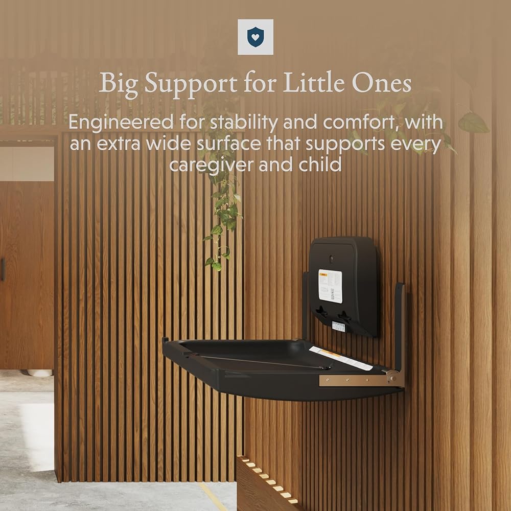 Inset logo on front of changing station provides a modern aesthetic, while the lightly textured surface hides scuffs and marks