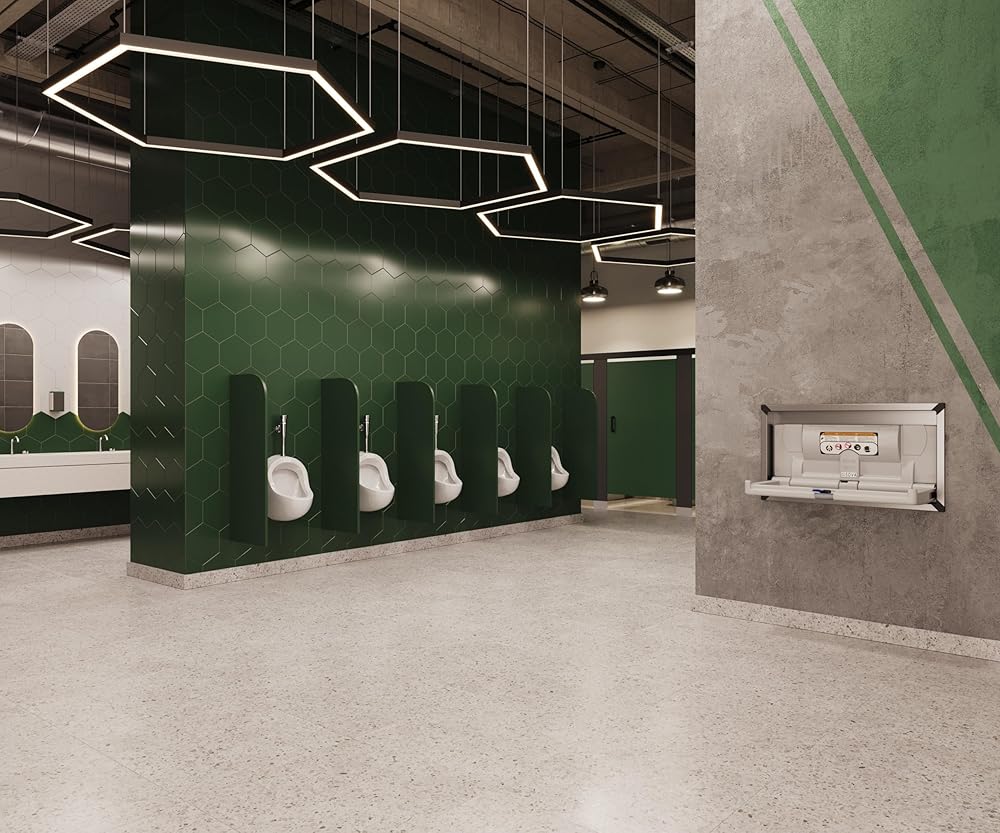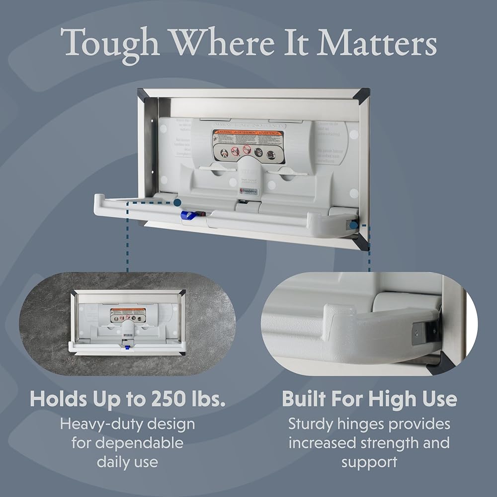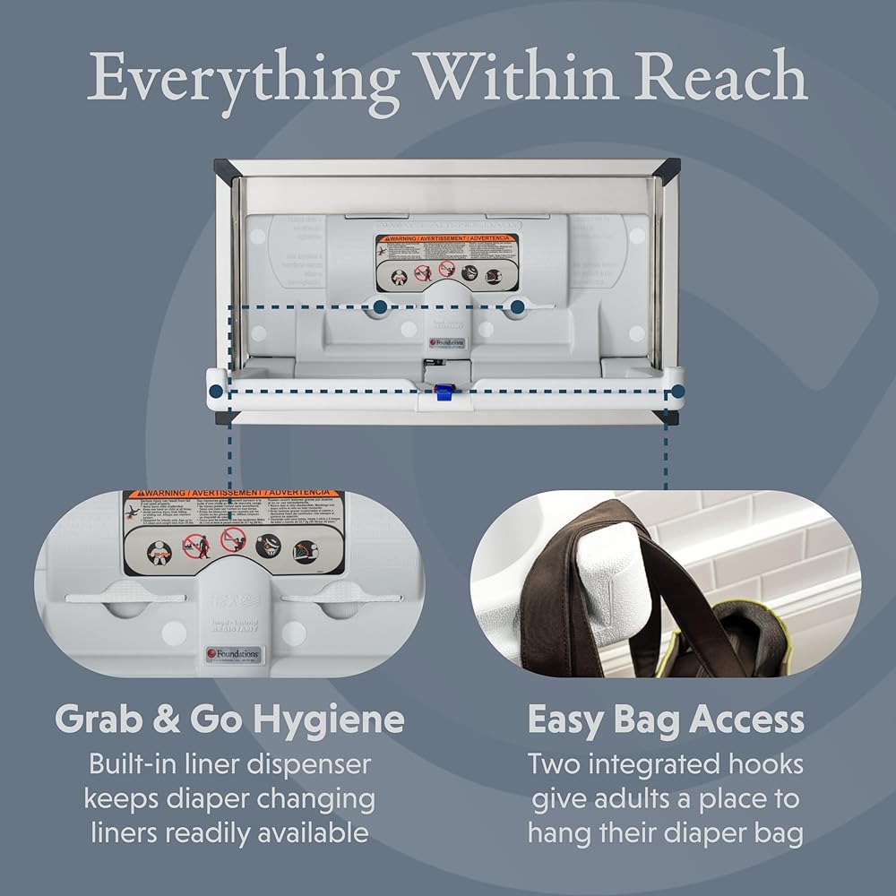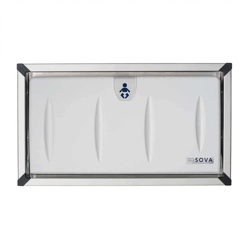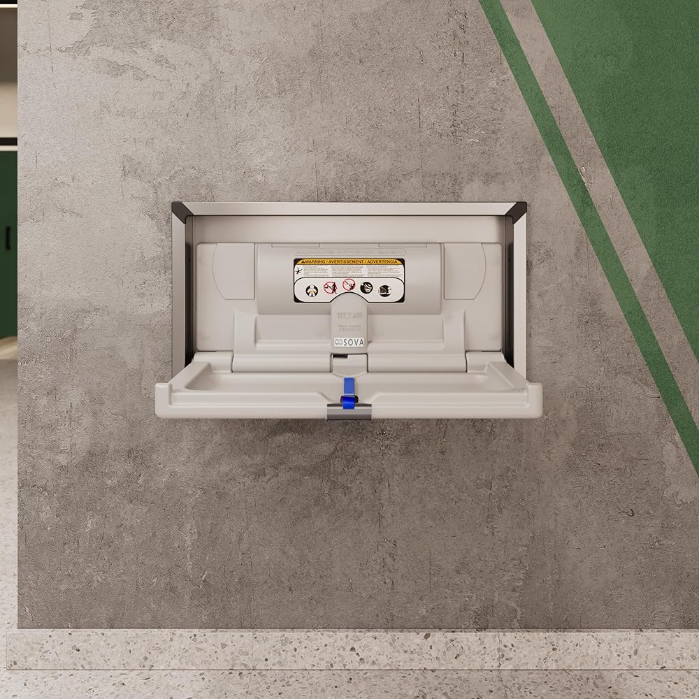 With its clean lines and range of finish options, Sova's Origin Recessed changing station seamlessly blends into high-design environments. This special model features a recessed mount and stainless steel housing for a sleek, built-in profile - ideal for upscale washrooms and modern architectural spaces. The interior is crafted from durable, high-density polyethylene that's easy to clean. A one-handed safety belt, made from an easy-to-sanitize composite material, ensures both safety and simplicity for caregivers. Convenient touches like a built-in liner dispenser and integrated coat/bag hooks offer added ease for parents and caregivers on the go. Recessed mount only. Weight capacity: 250 lbs.