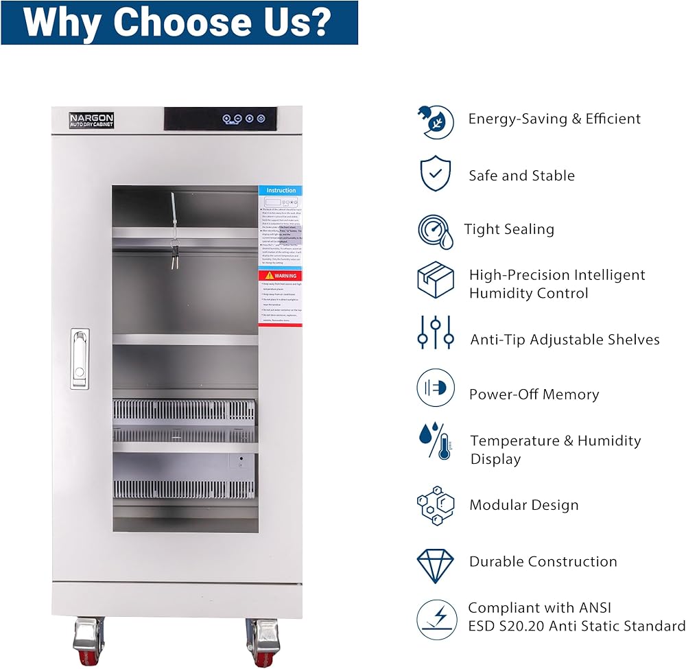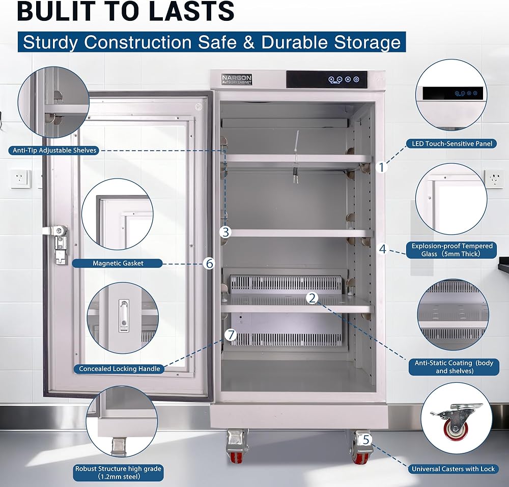 𝐑𝐨𝐛𝐮𝐬𝐭 𝐒𝐭𝐫𝐮𝐜𝐭𝐮𝐫𝐞 & 𝐋𝐚𝐫𝐠𝐞 𝐂𝐚𝐩𝐚𝐜𝐢𝐭𝐲: تستخدم الخزانة فولاذًا بسمك 1.2 مم وطلاء مضاد للكهرباء الساكنة (الجسم والأرفف). تعتمد الأرفف على تصميم يمنع الإغراق وقابل للتعديل، ويمكن لكل قطعة أن تتحمل 220 رطلاً. يمكنك إضافة أو تقليل الأرفف القابلة للتعديل حسب الحاجة. تتوافق جميع التصميمات مع معايير السلامة ESD.