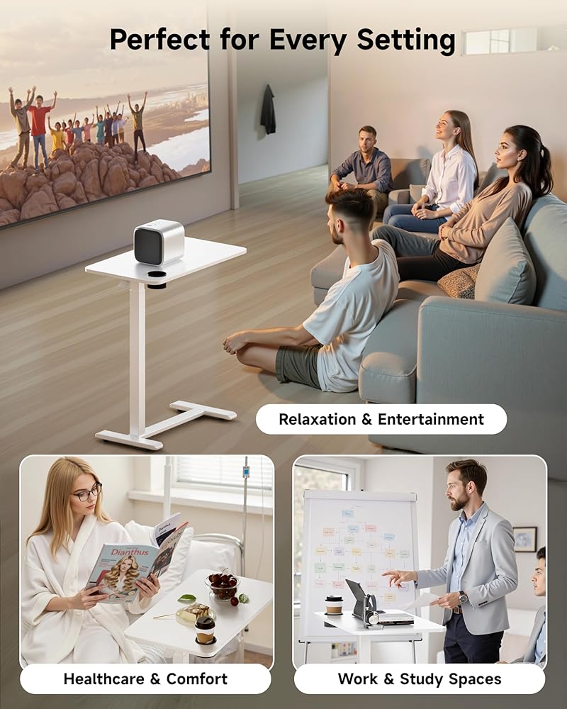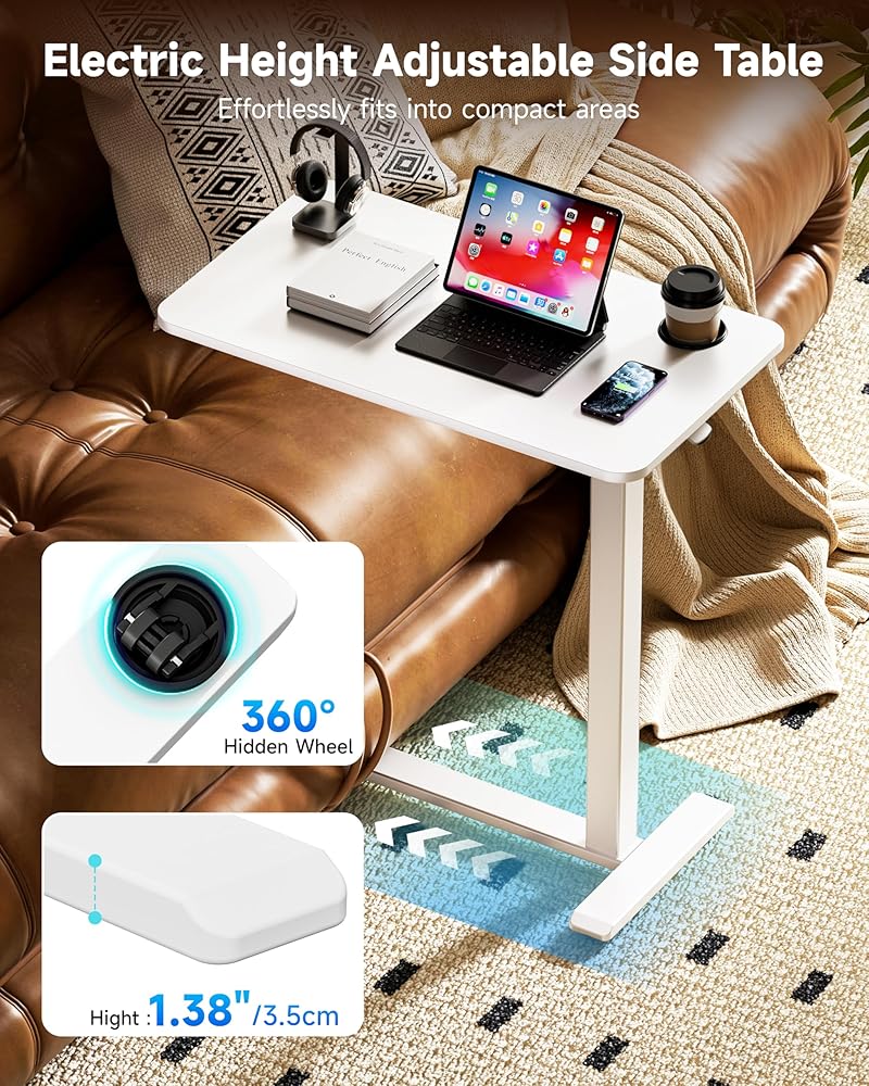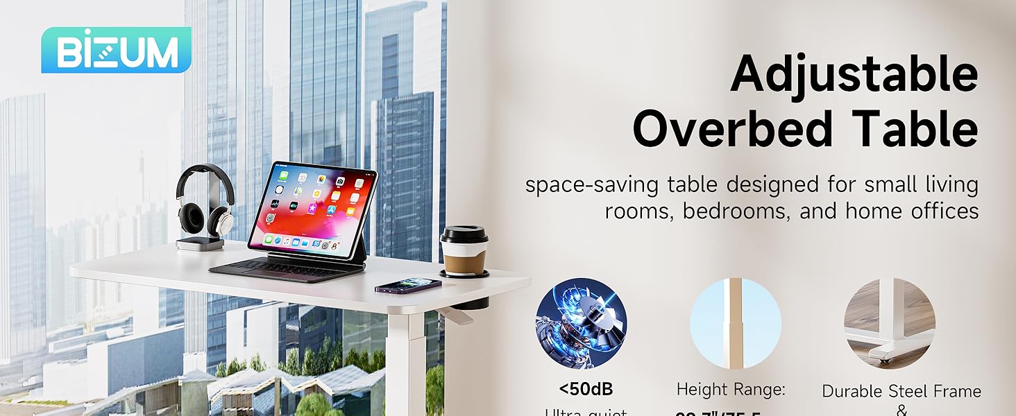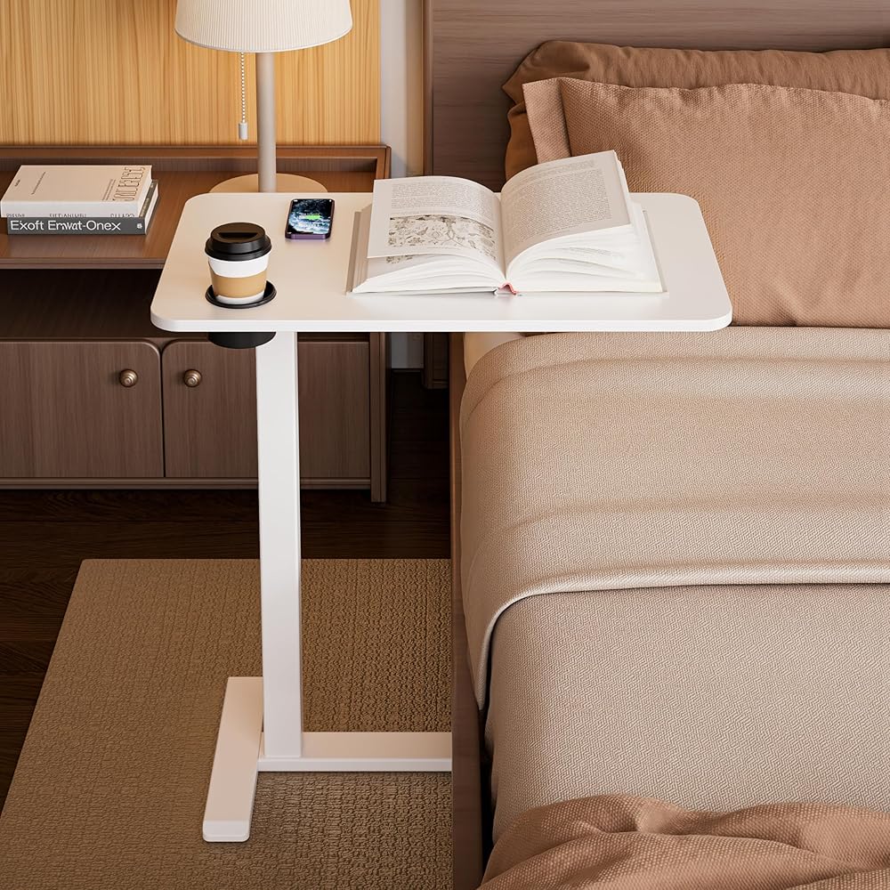 طاولة بجانب السرير قابلة للتعديل من BIZUM مع عجلات دوارة مخفية، مكتب قائم متنقل يعمل بالهواء المضغوط مع حامل أكواب لمنزل المستشفى (27.6 بوصة × 15.8 بوصة أبيض)