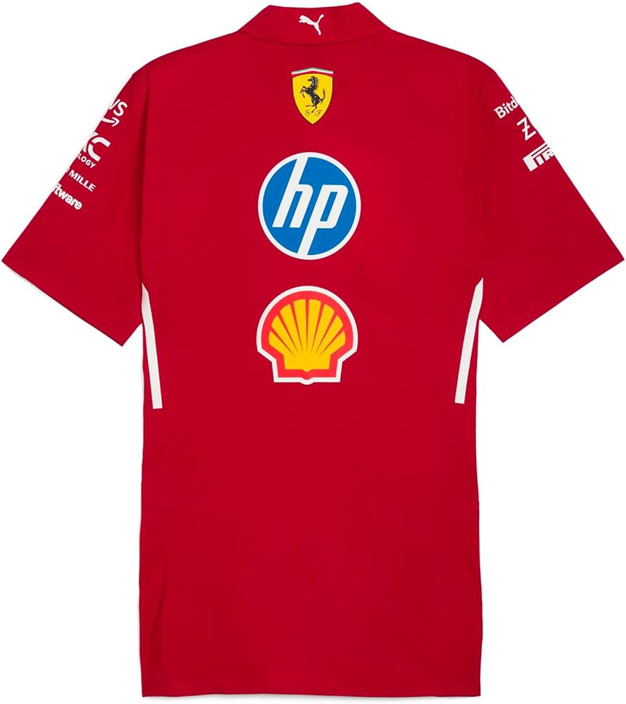 The official 2025 Scuderia Ferrari Team Shirt from PUMA, recognisable as being worn throughout the 2025 Formula 1 season by the team and drivers Lewis and Charles. In Ferrari's 2025 Scuderia Red, the collared Team Shirt has short sleeves and all the official Ferrari and PUMA branding.