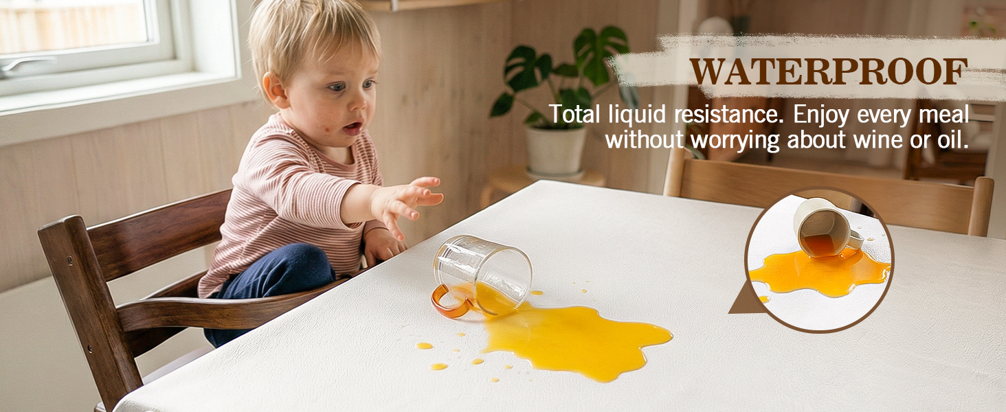 【مقاومة للماء بنسبة 100% وتنظيف سهل بالمسح】مصممة للمنازل المشغولة والأكل الفوضوي، سطحنا المضاد للانسكاب يطرد الماء والزيت وحتى صلصة السباغيتي العنيدة. ببساطة امسحها بقطعة قماش مبللة أو إسفنجة في ثوانٍ. لا مزيد من الضغط على الغسيل بعد عشاء العطلات أو وقت الأعمال اليدوية للأطفال؛ يضمن حاجزنا عدم وصول أي سوائل إلى سطح الطاولة الرقيق.