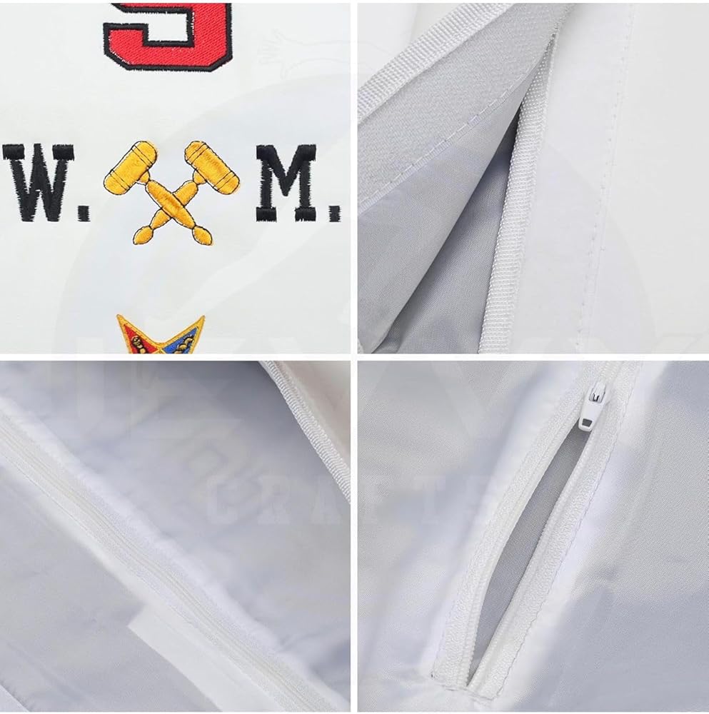 Carry and protect your ceremonial regalia with this white Masonic W.M. sash & gloves case, crafted from premium faux leather for durability and style. The front features a finely embroidered crossed gavels emblem, symbolizing the role of Worshipful Master, making it a meaningful accessory for meetings and events. Inside, a soft satin lining protects your sash and gloves from scratches, dust, and moisture. The hook-and-loop closure ensures quick access while keeping your regalia secure. An inner zippered pocket provides space for gloves, the detachable strap, or other small accessories. Designed for convenience, this case includes both a reinforced carry handle and a detachable, adjustable shoulder strap with sturdy metal hooks. Measuring 16.5 inches by 7 inches (approx. 3mm thick), it fits most Worshipful Master sashes and gloves. Lightweight (only 180g) yet durable, it's perfect for both travel and storage.