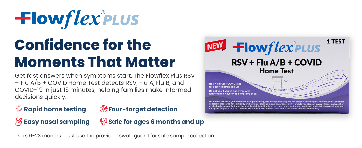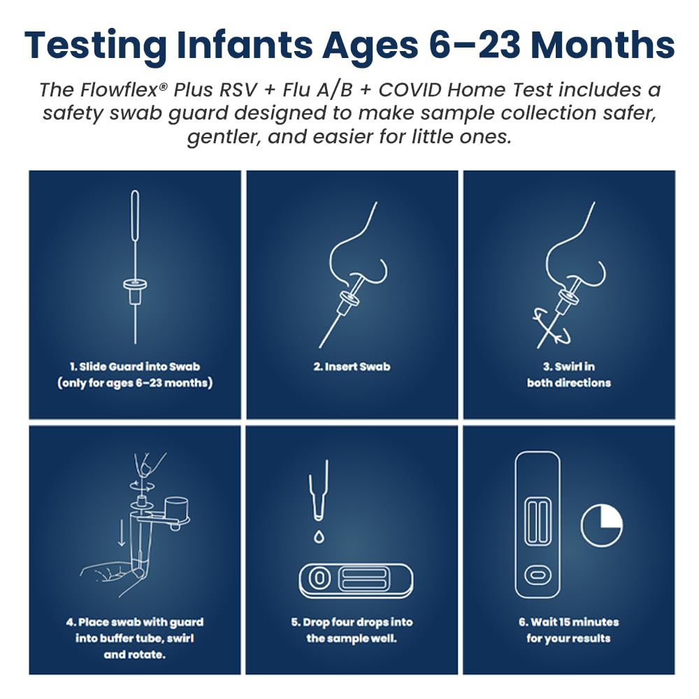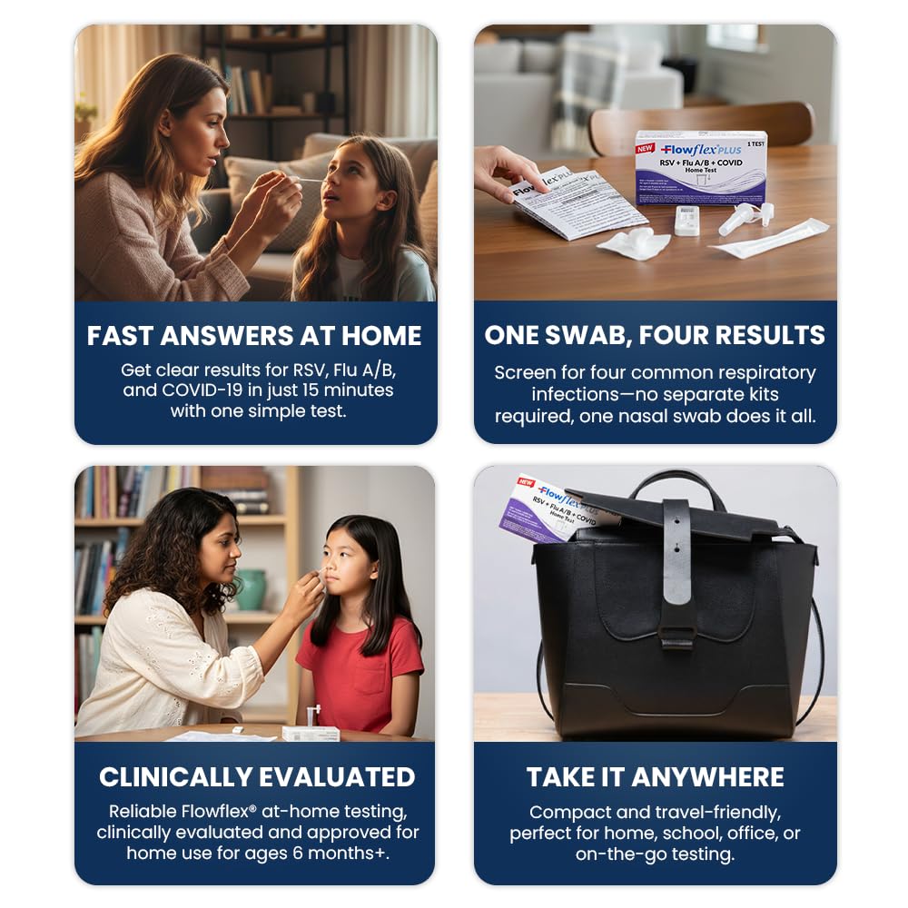 RAPID 15-MINUTE RESULTS : Get fast answers when symptoms start; the Flowflex Plus RSV + Flu A/B + COVID Home Test detects RSV, Flu A, Flu B, and COVID-19 in just 15 minutes, helping families make informed decisions quickly