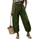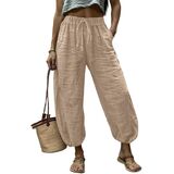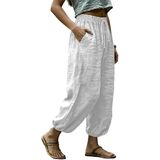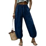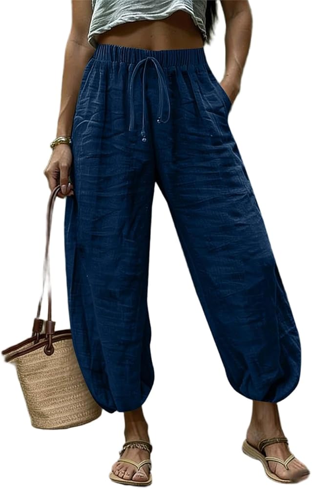 Womens Linen Pants Wide Leg Palazzo Capri Barrel Harem Pants Casual High Waisted Trousers with Pockets Beach