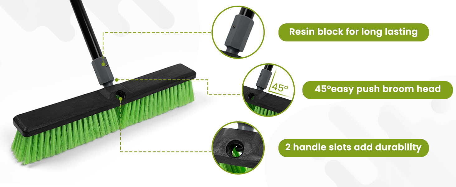 مكنسة العشب بزاوية 45 درجة - زاوية 45 درجة، تصميم مريح وسهل الدفع، يقلل الضغط على الركبتين والظهر. مزروعة بشعيرات ذات 6 صفوف، عالية الكثافة، فرشاة مكنسة الدفع الخارجية شديدة التحمل تساعد على تحسين كفاءة التنظيف.