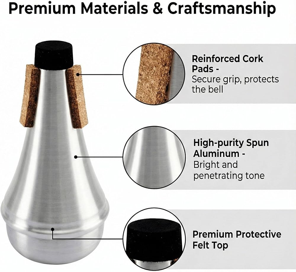 Secure & Protective Cork Seal】 Features high-quality, slip-resistant composite cork that ensures a snug, airtight fit inside the trumpet bell. The protective cork prevents the mute from falling out during performance and guards your instrument's interior finish against scratches and scuffs.