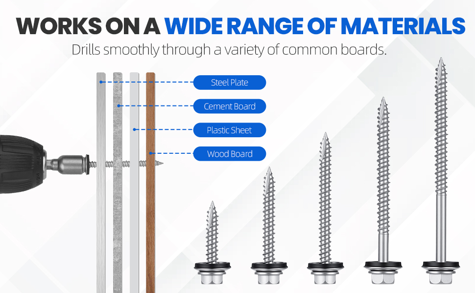 ✅ متعددة الاستخدامات لتطبيقات متعددة: مثالية لربط الأسقف المعدنية المموجة، وألواح البولي كربونات، وجوانب القصدير، والهياكل الخشبية. مثالية لعشاق الأعمال اليدوية والمهنيين الذين يعملون على الأسطح والشرفات والجراجات والمباني الخارجية.