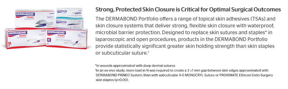 DERMABOND ADVANCED Adhesive is intended for topical application only to hold closed easily approximated skin edges of wounds from surgical incisions, including incisions from minimally invasive surgery, and simple, thoroughly cleansed, trauma-induced lacerations. DERMABOND ADVANCED Adhesive may be used in conjunction with, but not in place of, deep dermal stitches. For complete indications, contraindications, warnings, precautions, and adverse reactions, please reference full package insert.