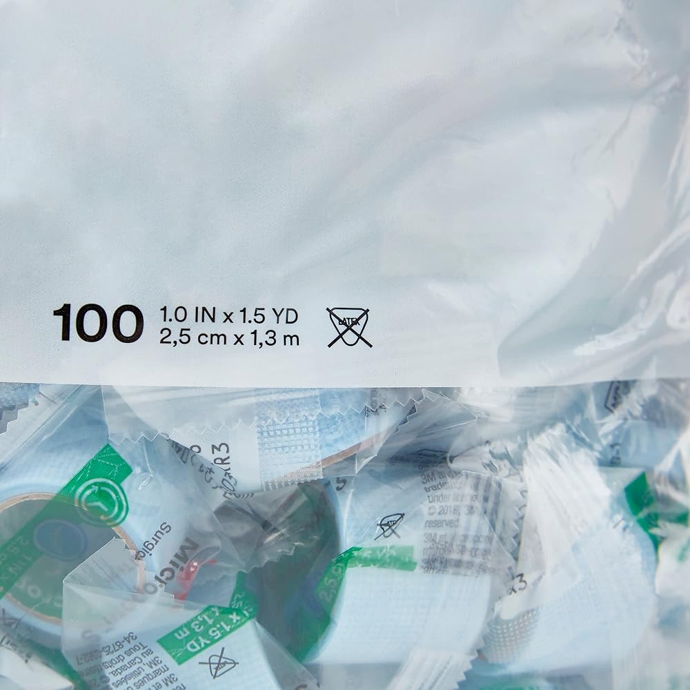 3M Micropore S Surgical Tape is a silicone based adhesive multi-purpose tape that provides reliable securement without causing damage to skin. Multi-purpose tape, for use with blood draws, dressings, I.V. lines and tubing, noncritical tubes, among other applications. - Blue medical tape is 1 inch x 1-1/2 yards and works well at any length you need: Simply tear each strip with fingertips.. Offers short-term and long-term (48 hour) reliable and pliable fixation. Comfort: Removes cleanly, without disrupting fragile skin layers or causing patients undue pain. Ease of use: Can be repositioned and neatly torn by hand. Helps reduce risk: Individually packaged single-use rolls can help protect patients by reducing the risk of cross-contamination.
