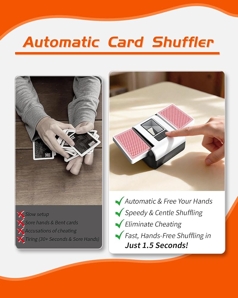 【Engineered for Speed & Simplicity】 The Auto Shuffler is engineered for effortless operation. Its advanced mechanism delivers a perfectly randomized deck in just seconds—far faster than manual shuffling. The compact and modern design isn't just stylish; it's built to save space on your table, making it the centerpiece of any game night.