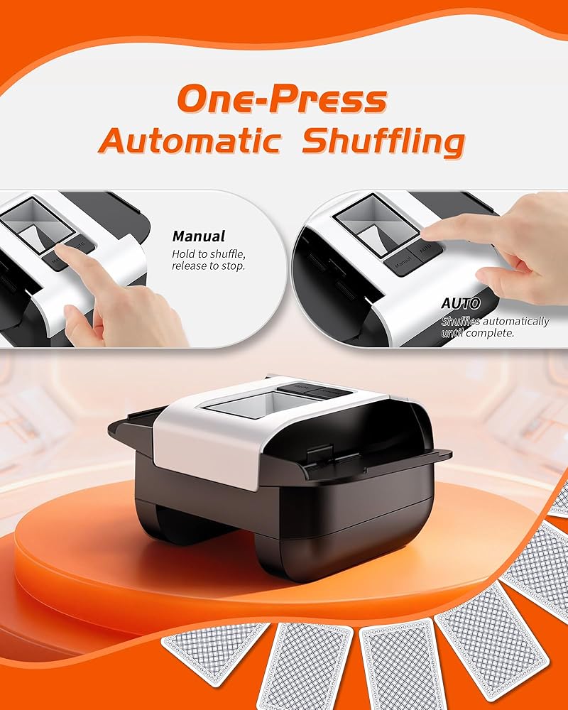 【Effortless One-Touch Automation】Experience the ultimate convenience with just one press of the "AUTO" button. Our smart shuffler automatically senses the cards and stops when the shuffle is perfectly complete. No more holding down buttons—your hands are free for dealing, snacks, or strategy.