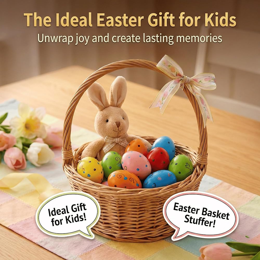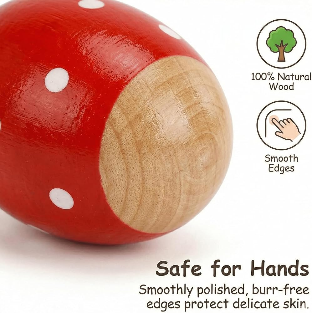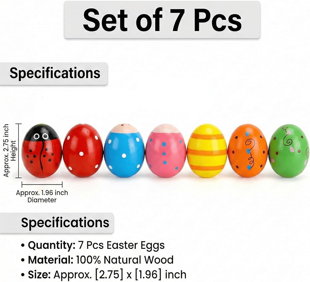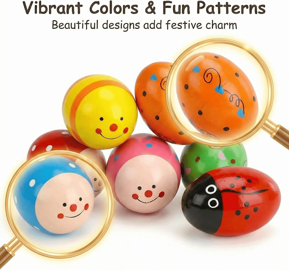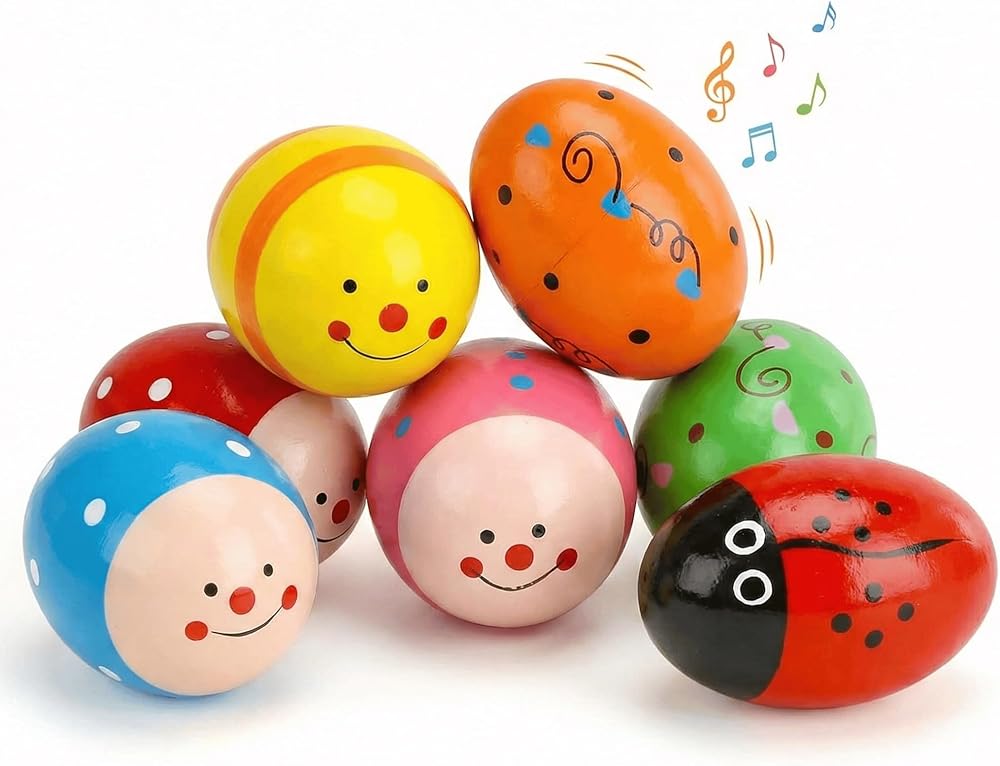Add a delightful musical dimension to playtime with these charming wooden egg shakers! This set includes 7 vibrantly painted percussion instruments that bring both visual and auditory joy. Each egg-shaped maraca features unique, cheerful designs including ladybugs, flowers, and playful patterns in bright colors like red, yellow, blue, green, and pink. Perfect for developing rhythm and coordination, these musical eggs produce gentle, pleasing sounds that encourage musical exploration. The comfortable egg shape fits naturally in small hands, making them ideal for young musicians. These percussion instruments can enhance music education, group activities, and creative play while helping children develop motor skills and musical awareness. The durable wooden construction ensures these maracas will withstand enthusiastic playing, while their lightweight design makes them easy for little ones to handle. Whether used in a classroom setting, music therapy, or just for fun at home, these colorful egg shakers bring music-making joy to all ages.