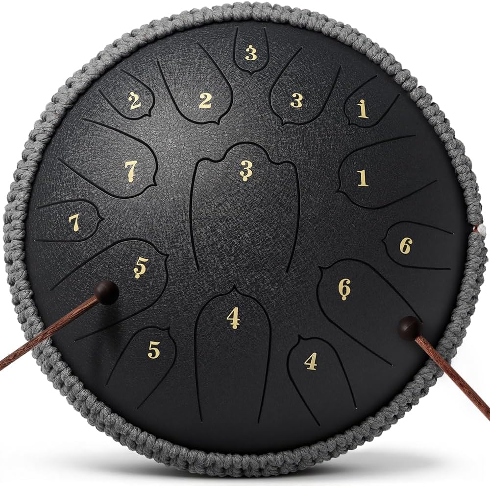 • Steel Tongue Drum, 12-inch 15-note D-tuned model. It is made of high-quality steel, featuring 15 notes and an ethereal tone. The 12-inch size is moderate and easy to carry, suitable for music performance, learning and entertainment.
