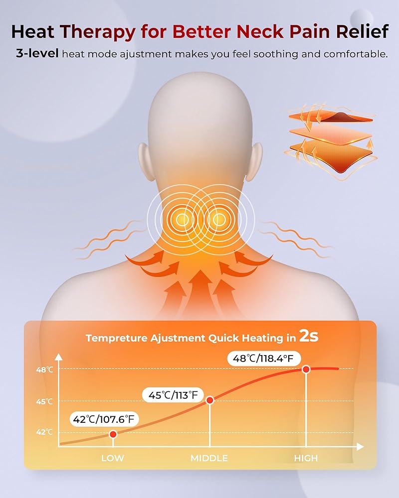 【علاج حراري لتخفيف آلام الرقبة بشكل أفضل】يحتوي جهاز تمديد الرقبة الساخن الخاص بنا لعلاج آلام الرقبة على عنصر حرارة مدمج، وتتوفر 3 مستويات من درجة الحرارة لضبطها. درجة الحرارة مهدئة ومريحة. قم بالتمدد لمدة 10-15 دقيقة يوميًا لتخفيف آلام وتصلب عضلات الرقبة بسهولة. (ملاحظة: لا تستخدمه طوال الليل.)
