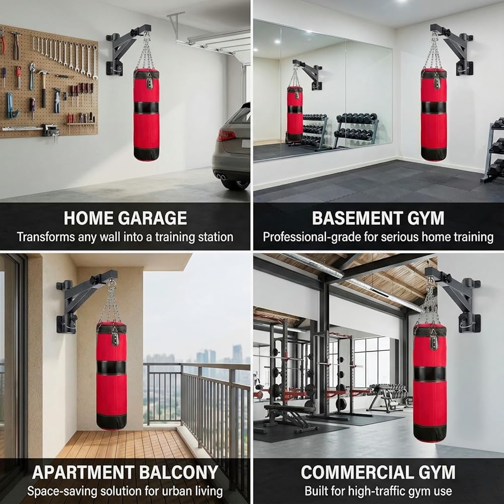 【Heavy-Duty 800LB Capacity Construction】Built with high-grade steel and reinforced welding, this wall mount securely holds heavy bags up to 800 lbs. The professional-grade design ensures reliable performance during intense training sessions with punching bags, speed bags, or sandbags