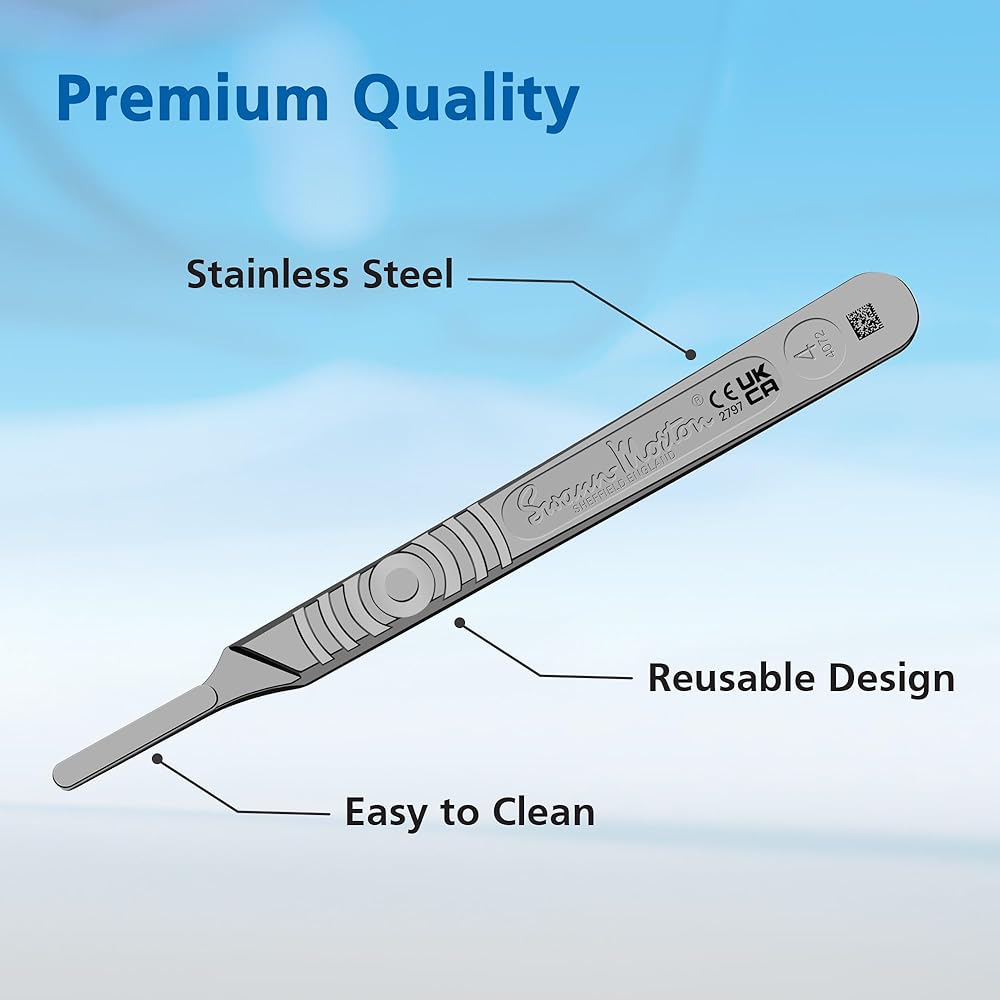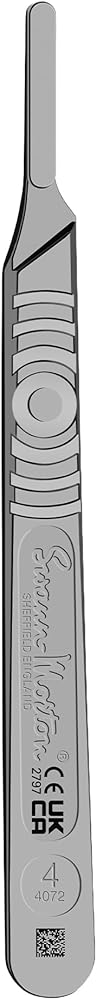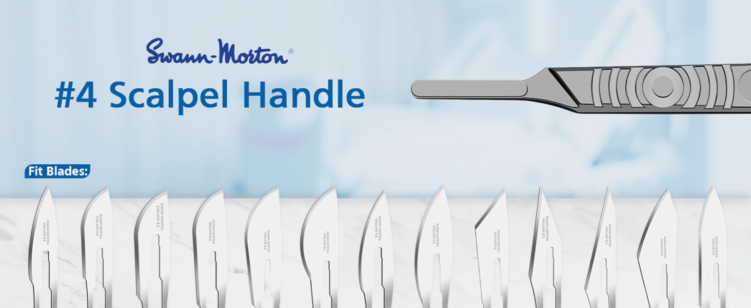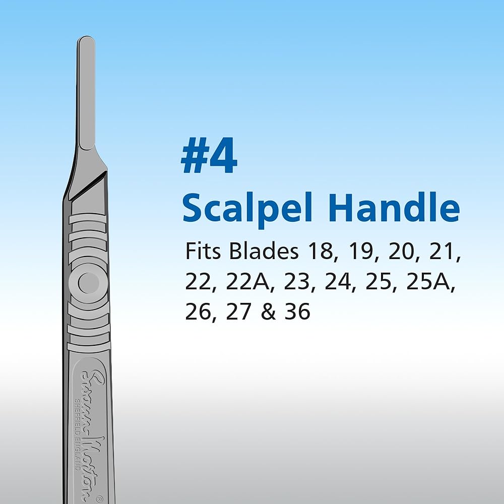 • مقبض المشرط رقم 4: مصمم ليناسب الشفرات 18، 19، 20، 21، 22، 22A، 23، 24، 25، 25A، 26، و27، يوفر هذا المقبض التوافق مع الشفرات الجراحية والهوايات الشائعة.