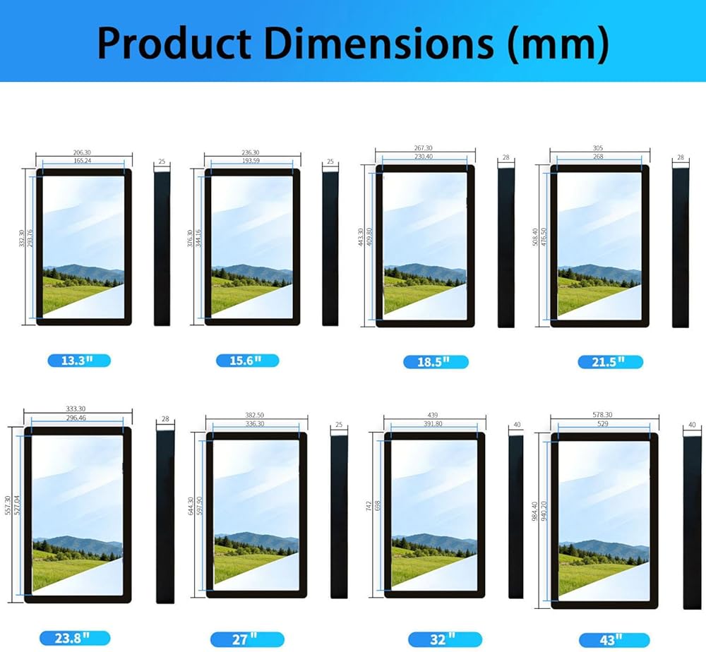 Screen Size: 13.3"/ 15.6"/ 18.5"/ 21.5" / 23.8" / 27" / 32"/ 43"
