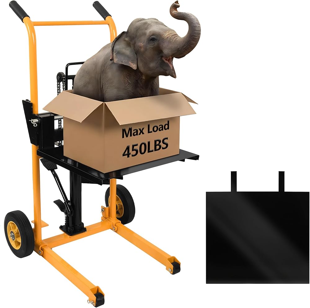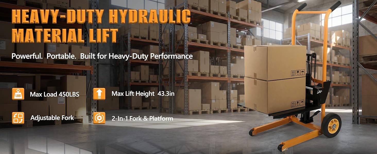 • قوة رفع شديدة التحمل تبلغ 450 رطلًا: مصنوعة من الفولاذ الكربوني المقوى، تعمل هذه الرافعة اليدوية الصناعية على رفع الأحمال بأمان حتى 450 رطلًا باستخدام نظام دواسة القدم الهيدروليكي السلس. ترتفع الشوكات من 2.75 بوصة إلى 43.3 بوصة، مما يسمح برفع دقيق ومتحكم للمنصات والصناديق والمعدات.