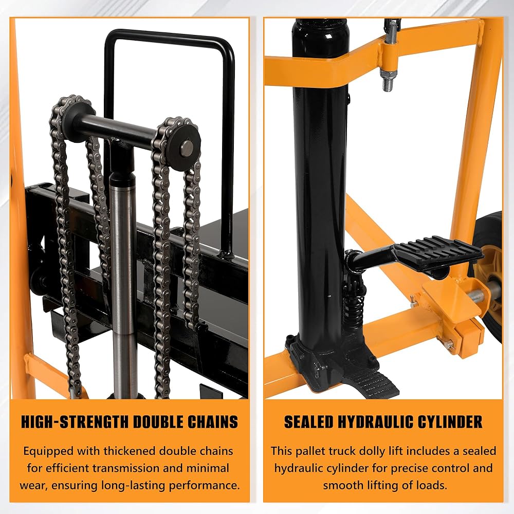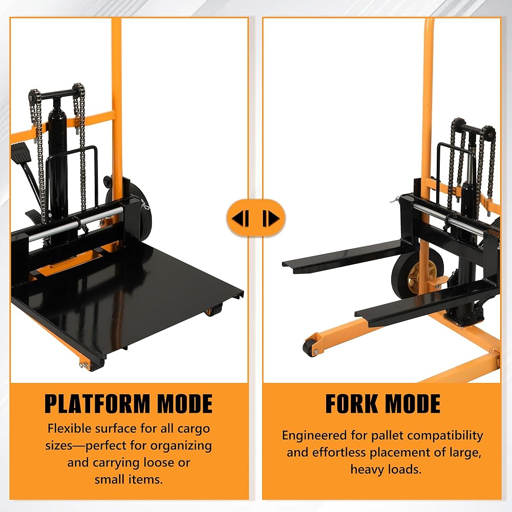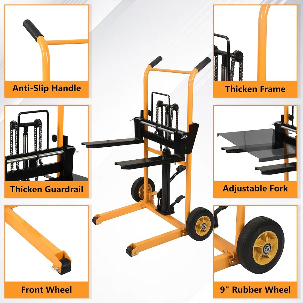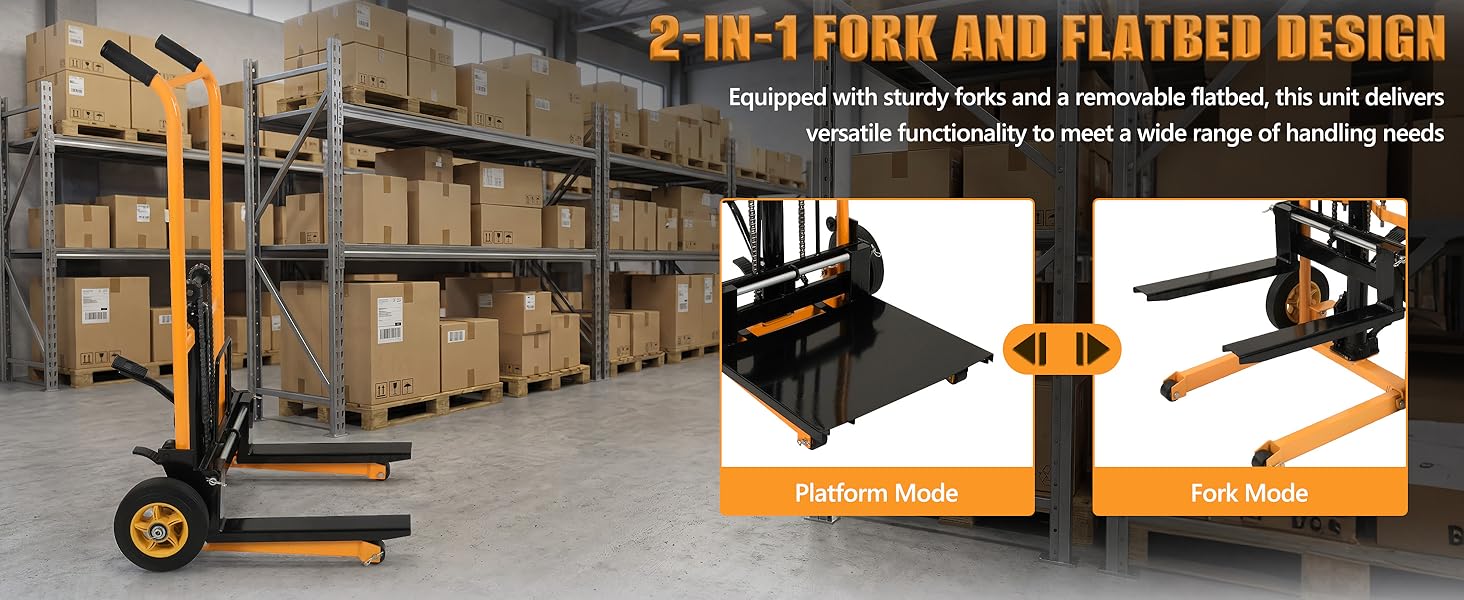 • 【تصميم مكدس وشاحنة يدوية 2 في 1】استخدمها كمكدس رفع للمواد للرفع الرأسي أو قم بتحويلها بسرعة إلى شاحنة يدوية للنقل. مثالية للمستودعات والمصانع وورش العمل ومحلات البيع بالتجزئة وغرف التخزين وأرصفة التحميل.