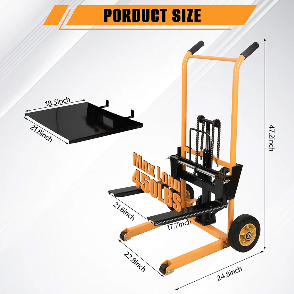 مكدس المواد اليدوي بسعة 450 رطلًا، رفع دواسة القدم الهيدروليكية، نطاق رفع الشوك القابل للتعديل، منصة قابلة للإزالة، مكدس يدوي من الفولاذ الكربوني شديد التحمل مع عجلات من البولي يوريثان لتحميل متجر المستودعات