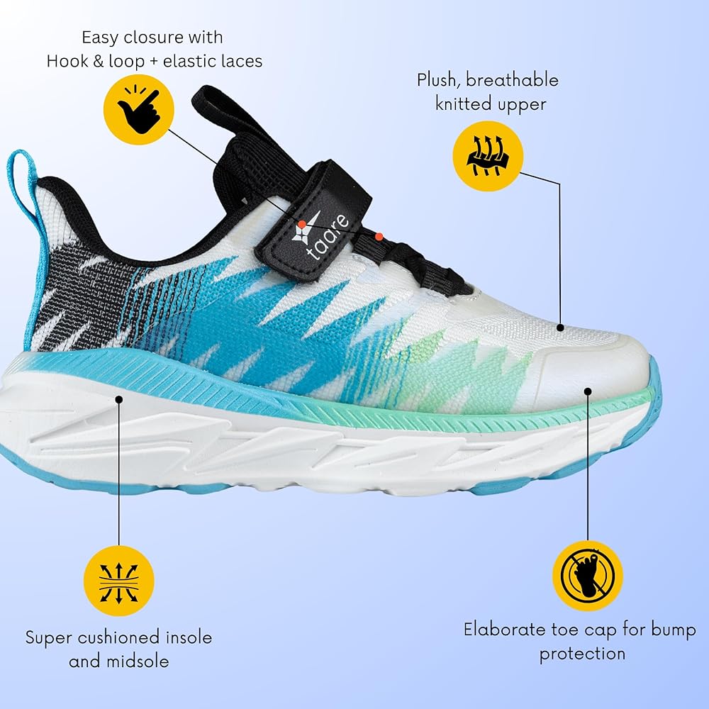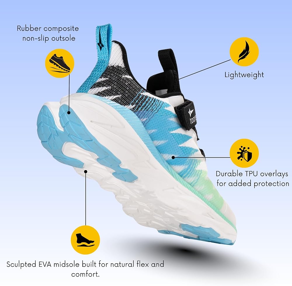 الإغلاق والمقاسات: أحزمة سهلة الارتداء تجعل من السهل على الأطفال ارتداء أحذية الجري الخاصة بهم بشكل مستقل، مما يعزز الثقة اليومية. يناسب المقاسات الأمريكية من 10.5C إلى 3Y، مثالي للأطفال من سن 4 إلى 8 سنوات.
