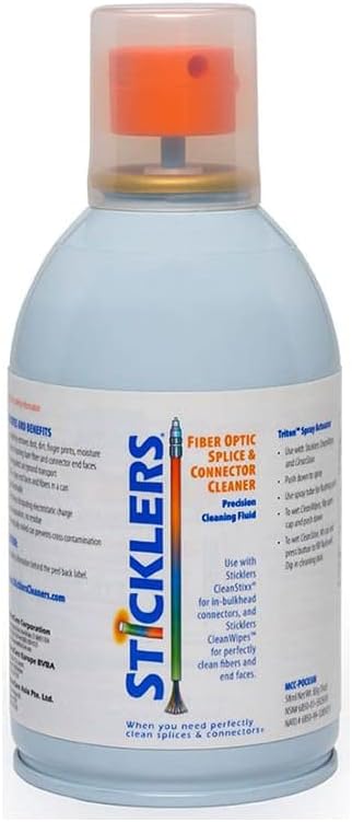 Sticklers MCC-POC10M - Fiber Optic Cleaning Fluid (Pump Spray, 280g / 240mL) Applications include: Pigtails and bare fibers for fusion splicing Splicing plastic optical fibers and connectors Suitable cleaning fluid for tool kits Ribbon fibers for mass fusion splicing Ceramic and composite ferrules Most glass and plastic photonic lenses The Sticklers Fiber Optic Splice & Connector Cleaning Fluid is a nonflammable fiber optic cleaning fluid which doesn't use alcohol or water. It's specifically engineered for fiber optic connectors and for use during fusion splicing. Ultra-pure, no residues, fast-drying, spill-proof. This cleaning fluid hugely out-performs alcohol, and enhances the cleaning efficiency of any wipe, swab or cleaning tool. More than 650+ cleanings per container for maximum savings. Unlimited shelf-life if properly stored; this product has no expiration date. Non-hazardous, nonflammable for easy shipping and storage: it even can be carried on commercial aircraft. Made in the USA. Globally GHS, RoHS and REACH compliant.