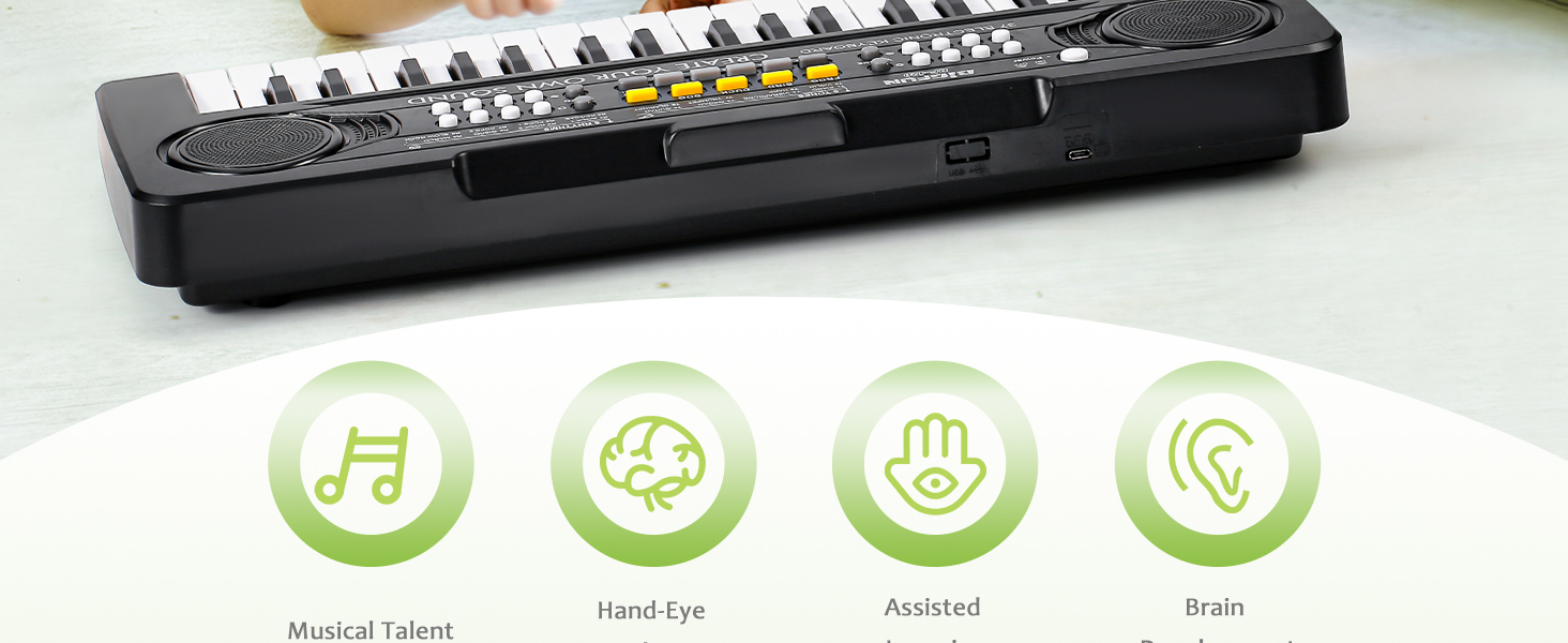 【مادة آمنة ولوحة مفاتيح موثوقة】مصنوعة من مادة أكريلونتريل بوتادين ستايرين الآمنة والصديقة للبيئة مع صنعة متقنة وتصميم حافة ناعمة، مما يضمن سلامة الأطفال أثناء اللعب. الحجم المحدث لمفاتيح البيانو إلى 2.55*0.59 بوصة مناسب لأصابع الأطفال الأمريكيين، مما يجعل عملية اللعب سهلة وآمنة.