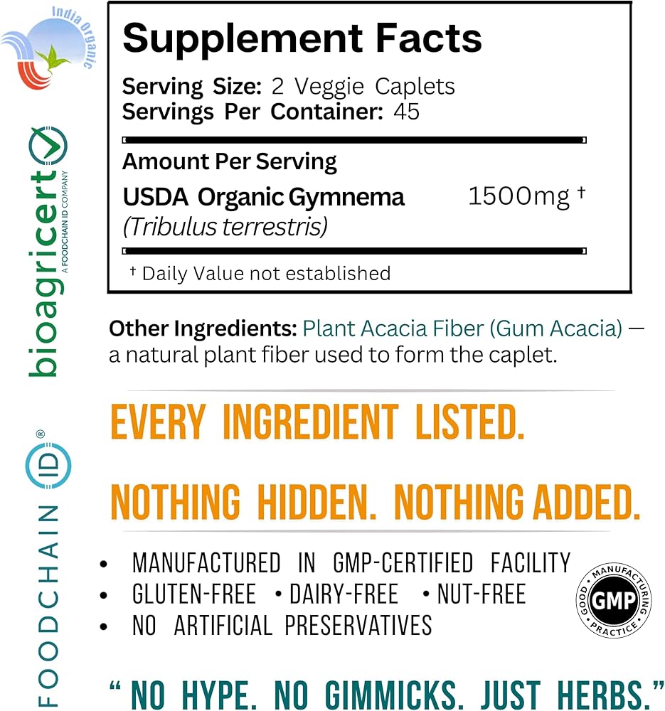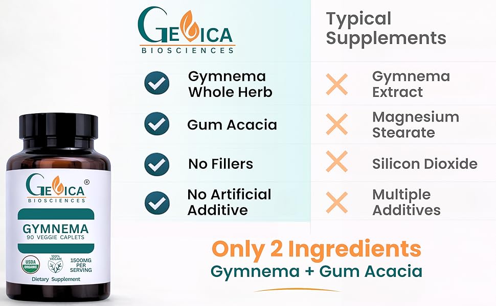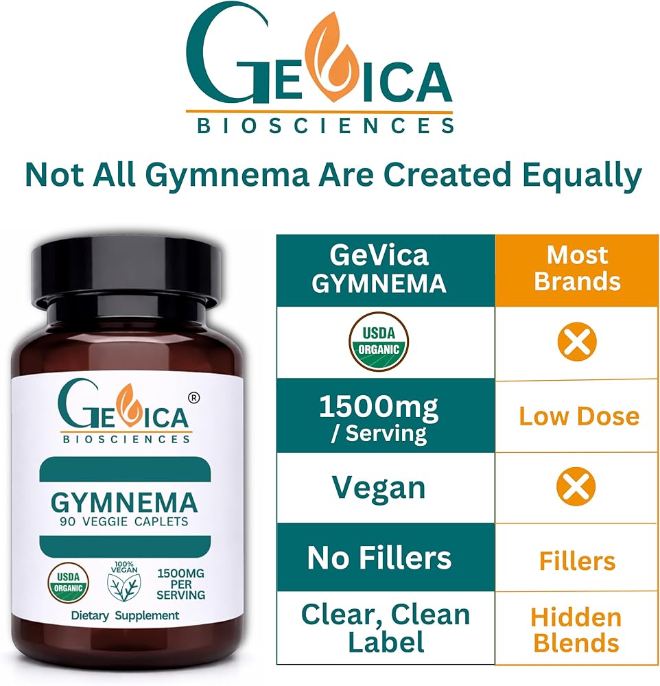 ما الذي يجعل Gymnema من GeVica استثنائيًا حقًا؟ لا الضجيج. لا الحيل. فقط جيمنيما سيلفستر عضوي من وزارة الزراعة الأمريكية - عشب كامل، مجفف تقليديًا في الظل، ولم يتم استخلاصه أبدًا. ممزوج فقط مع صمغ السنط الطبيعي.
