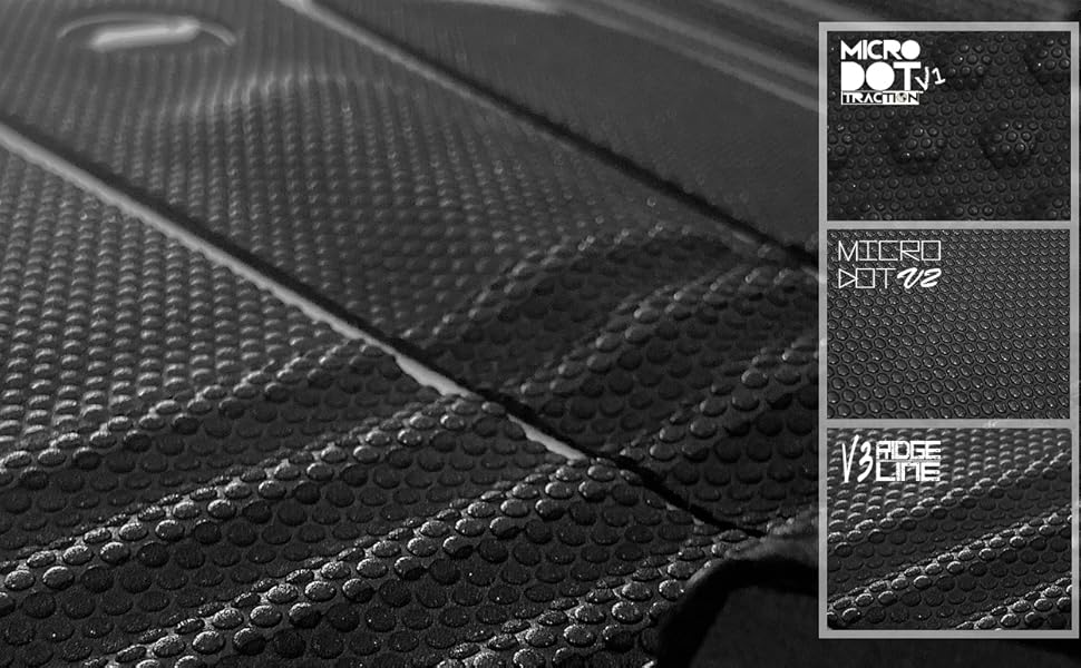 • MICRO-DOT: This surf grip features our V2 flat Micro-Dot groove pattern on 3 color options and the V1 traditional pyramid groove pattern on one color. Micro-Dot traction is thinner for better board feel, absorbs less water, gets grippier when wet and is less likely to rash your knees in tropical climates.