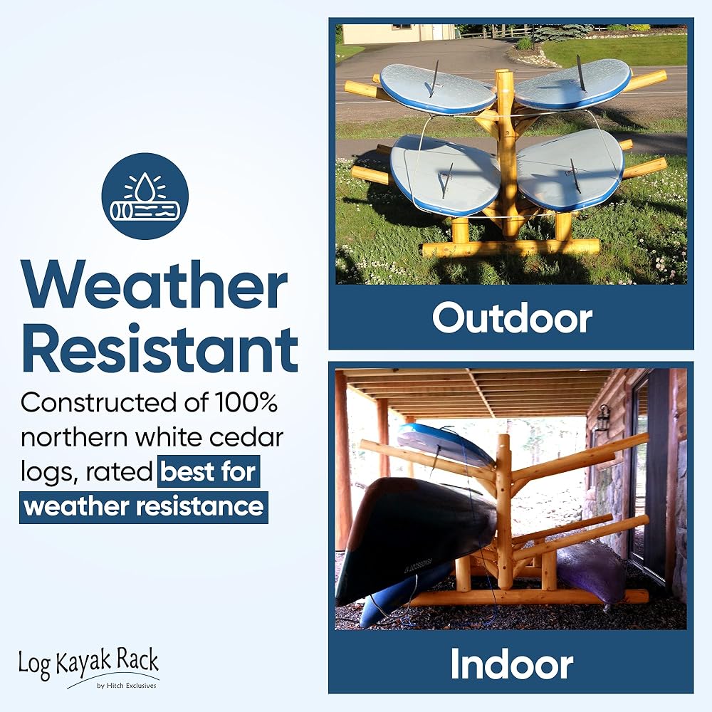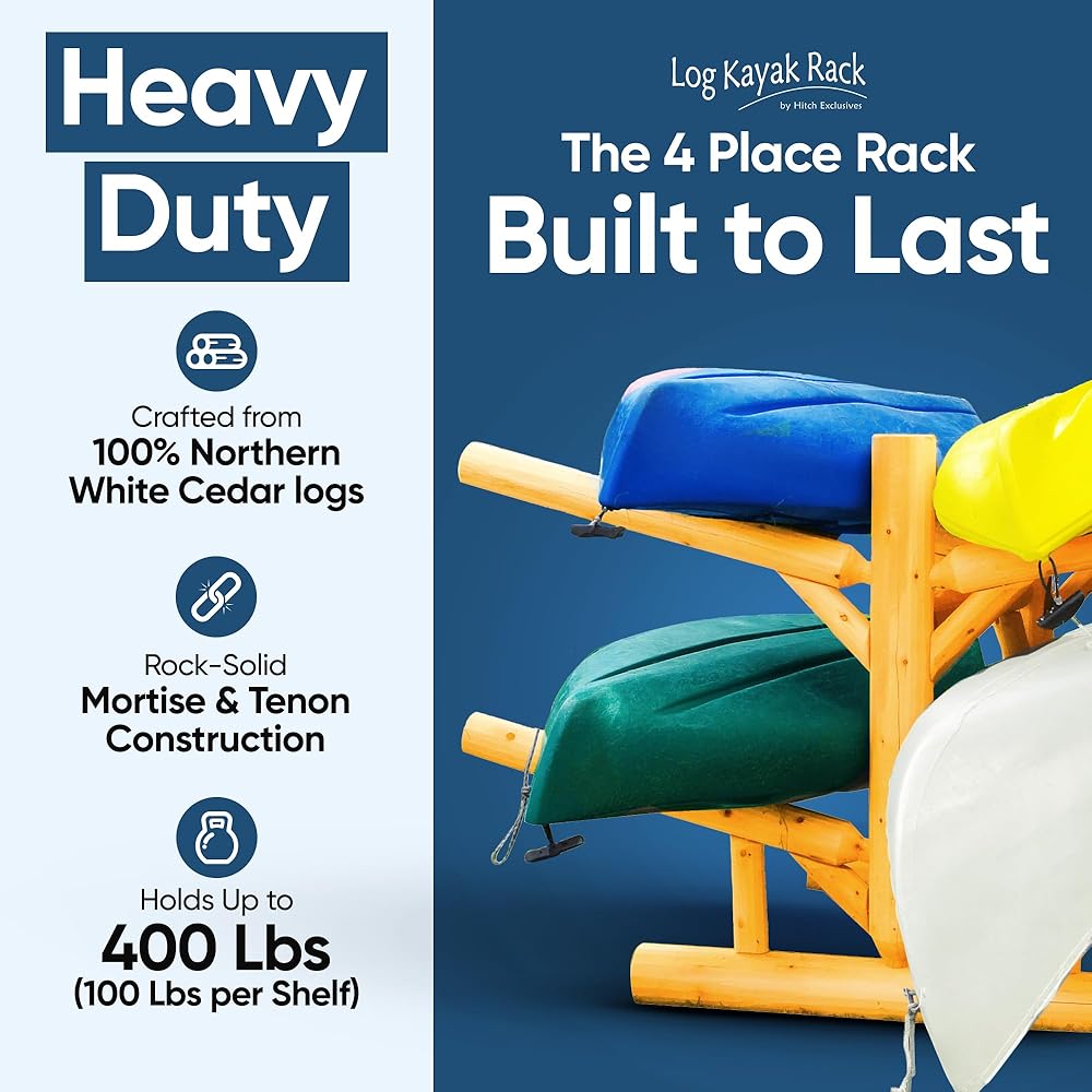 PREMIUM CRAFTSMANSHIP: Crafted with 100% Northern White Cedar from Michigan's Upper Peninsula, this freestanding kayak rack is both functional and visually appealing. Handcrafted by skilled artisans in Northern Wisconsin, each joint is meticulously glued and screwed using mortise and tenon joinery for enhanced durability. With a capacity to hold up to 4 watercrafts, including canoes, surfboards, kayaks, & SUPs, each slot can support up to 100 pounds, totaling an impressive 600 pounds overall.