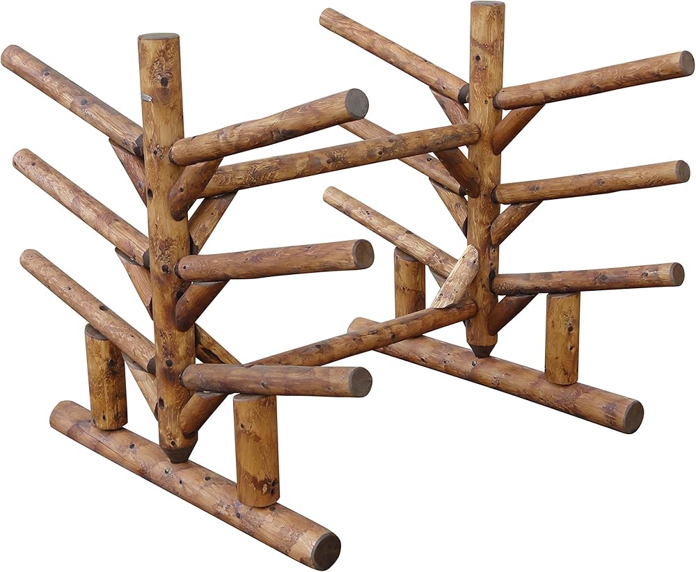 EXCEPTIONAL CAPACITY: This compact and sturdy paddle board holder for dock supports up to 100 lbs per board, with a total weight capacity of 500 lbs. Measuring 50"H x 60"D x 53"W, it offers reliable, space-saving storage for SUPs, surfboards, and canoe paddles. With a log-construction look that complements lakefront homes or garages, it's a stylish, heavy-duty solution built for long-lasting performance.