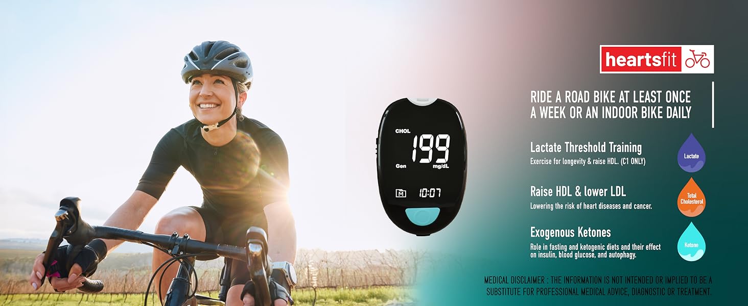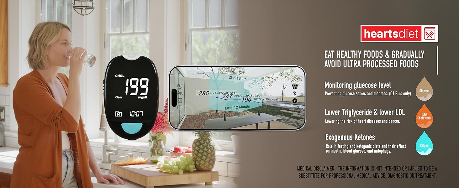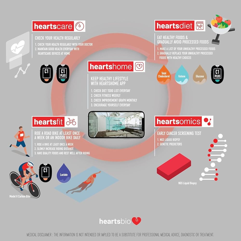 مجموعة اختبار HeartsCare C1 Plus لمقياس الكوليسترول الكلي في المنزل مع عدد TC 10 مع تطبيق HeartsHome ثلاثي الأبعاد بتقنية البلوتوث.