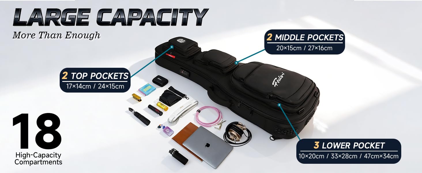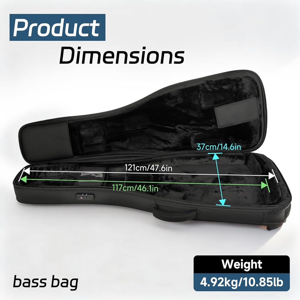 • 【معلمات المنتج】: متوافق مع جيتار الجير الذي يصل طوله إلى 117 سم، وطوله الإجمالي 121 سم، وأقصى عرض 37 سم. مناسبة لكل من أنماط Jazz Bass وPrecision Bass.