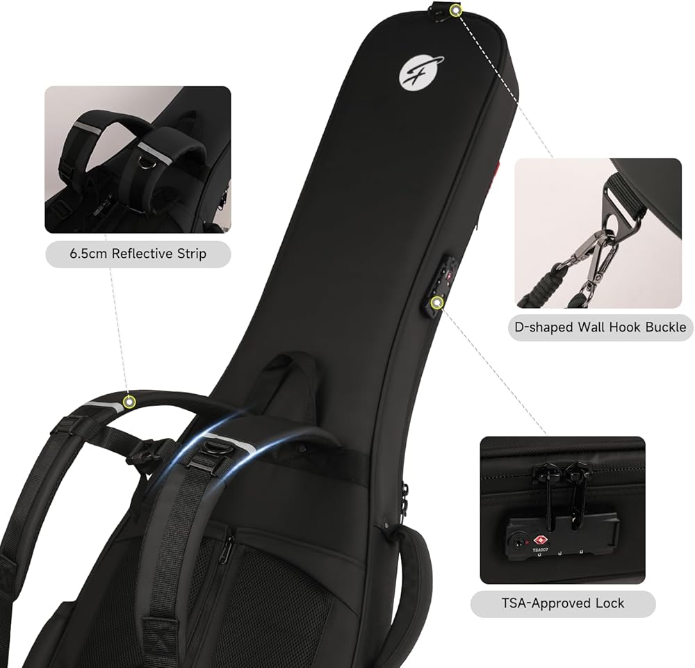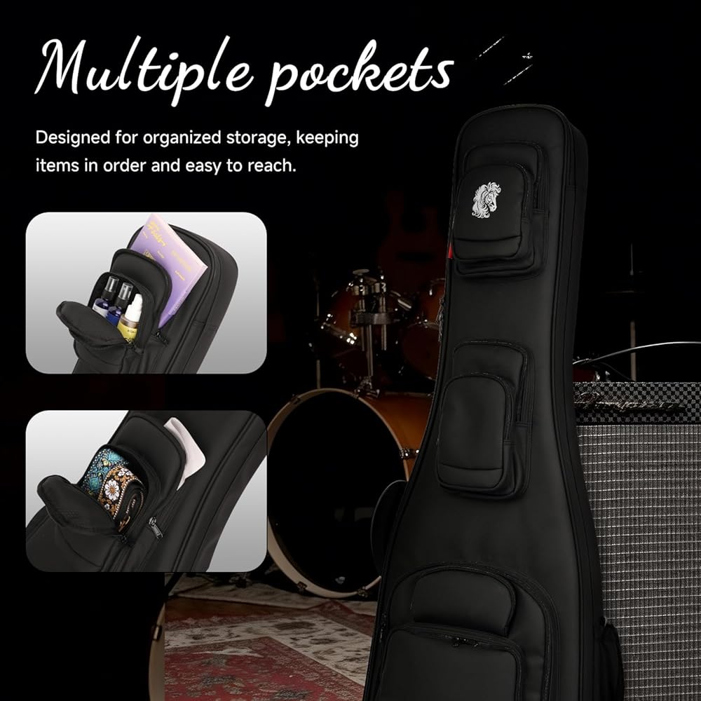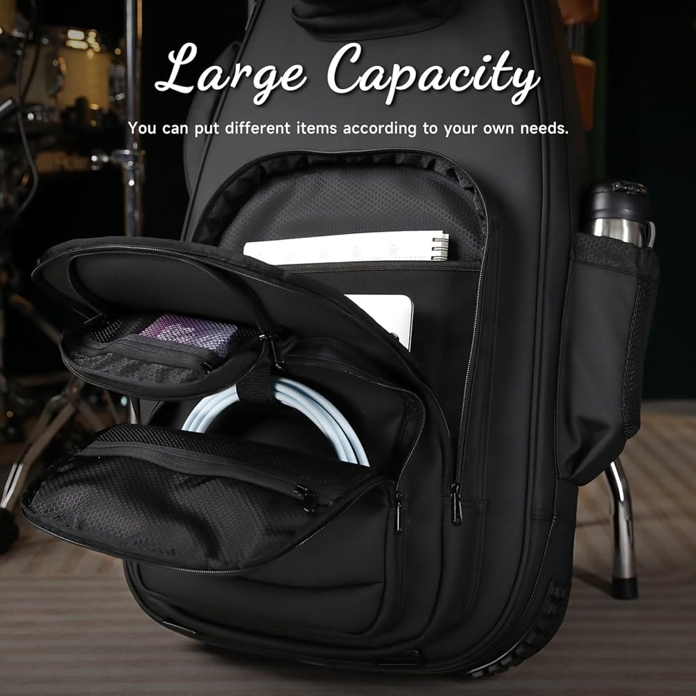 • 【غلاف متين مقاوم للماء】: مصنوع من مادة مقاومة للماء 1800D تطرد البقع والأوساخ. يتم تعزيز مناطق الاحتكاك العالي بنسيج متين لمقاومة التآكل وإطالة عمر المنتج. ويأتي مع غطاء جيتار مقاوم للماء والغبار مجانًا لمزيد من الحماية - طبقات مزدوجة وراحة بال مزدوجة.