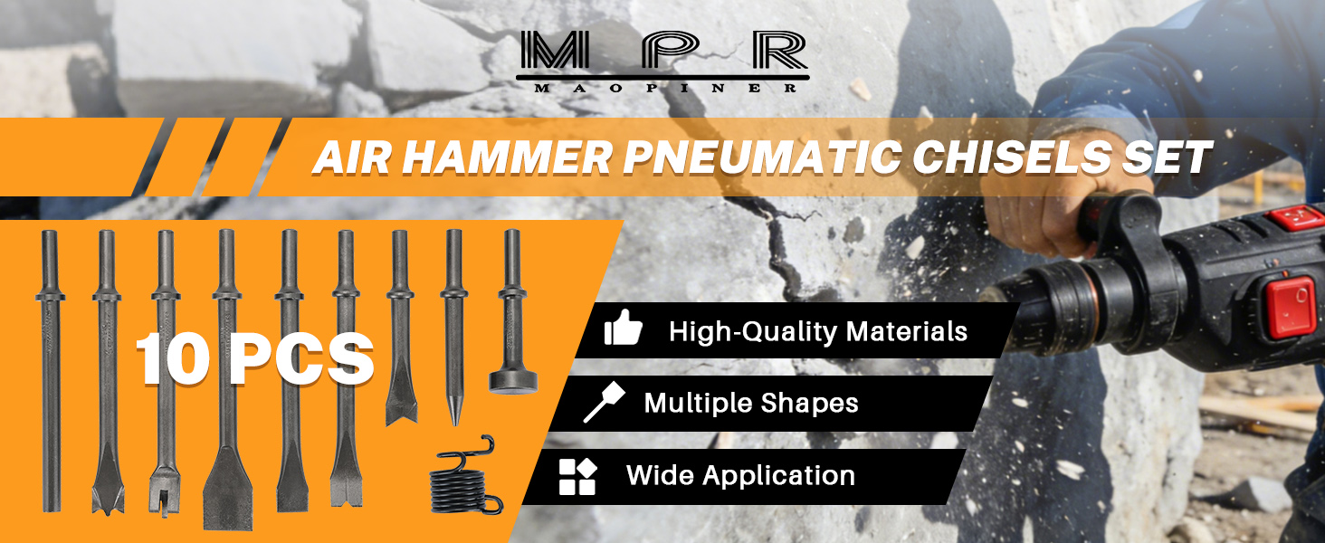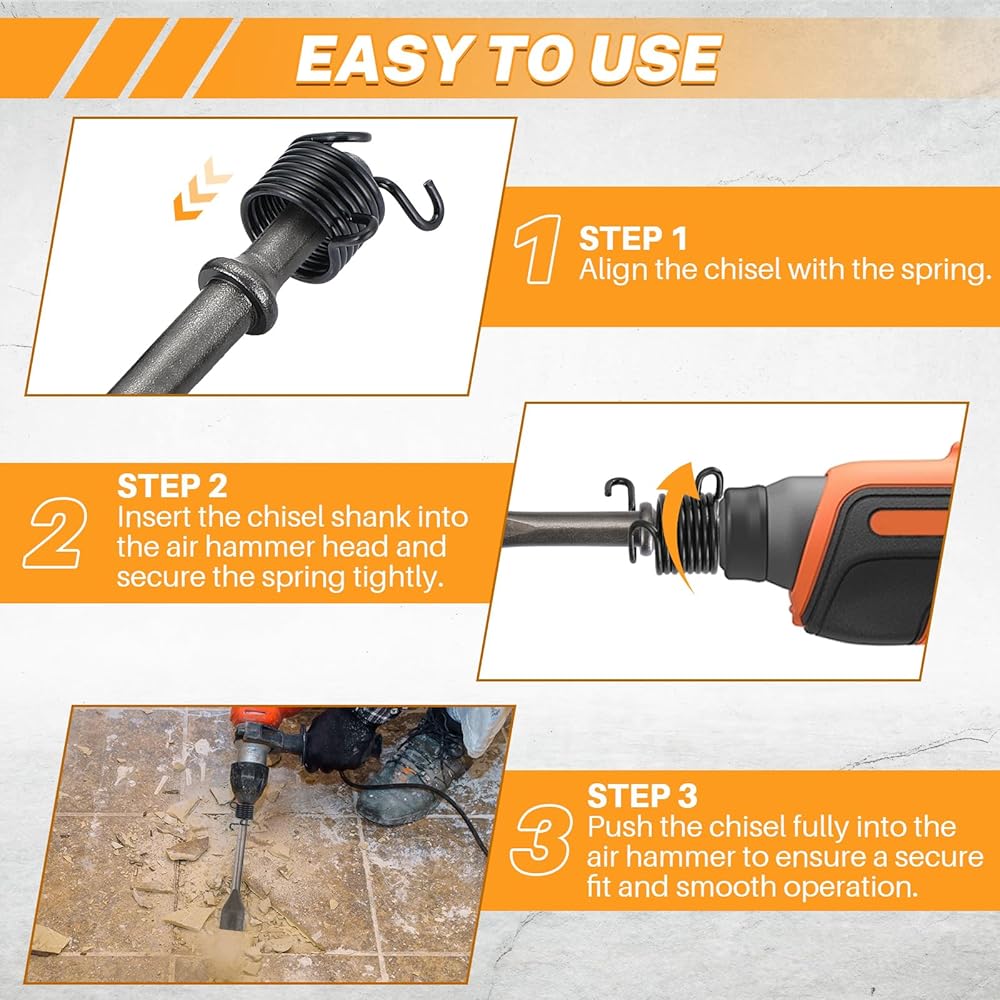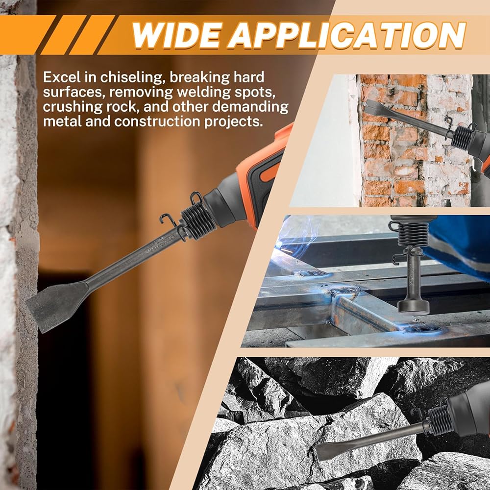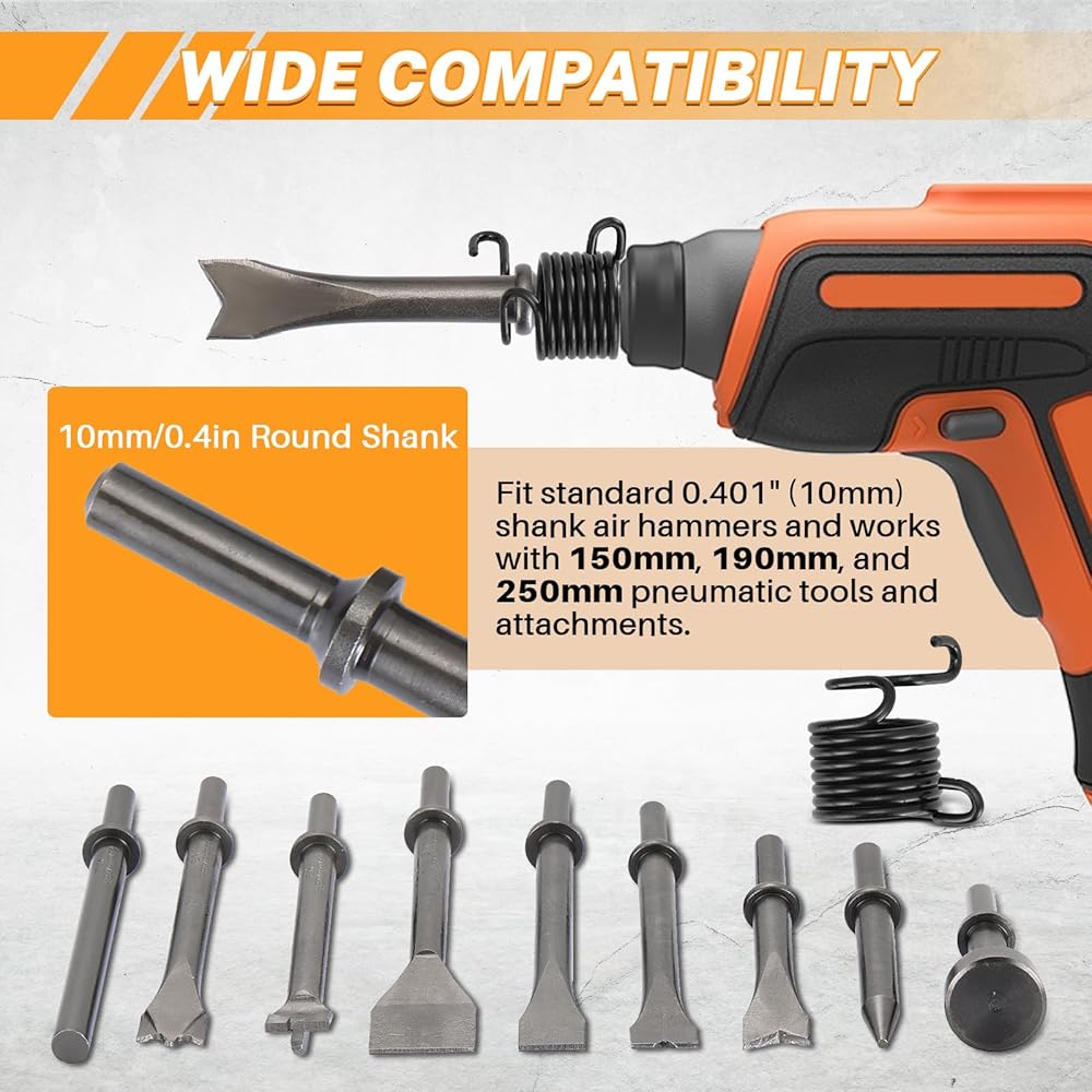 • توافق واسع: مصممة لتناسب المطارق الهوائية ذات الساق القياسية 0.401 بوصة (10 مم)، تعمل مجموعة مطرقة إزميل الهواء الهوائية هذه بسلاسة مع أدوات هوائية 150 مم، 190 مم، 250 مم، وكاشطات، وملحقات مطرقة الهواء الأخرى.