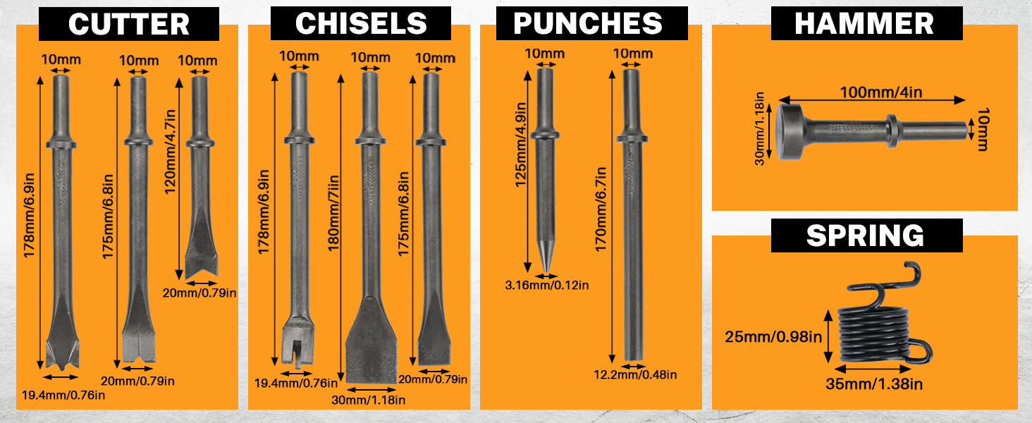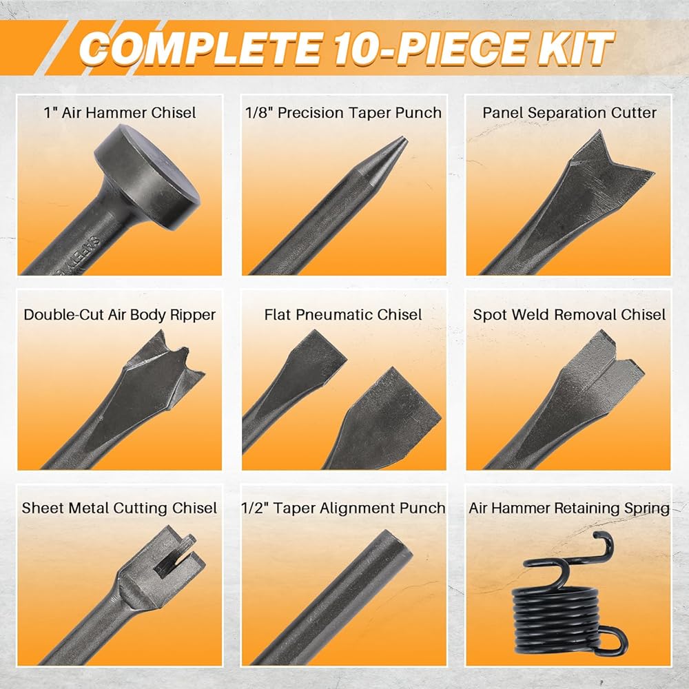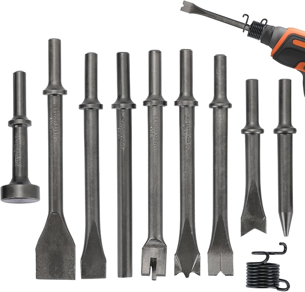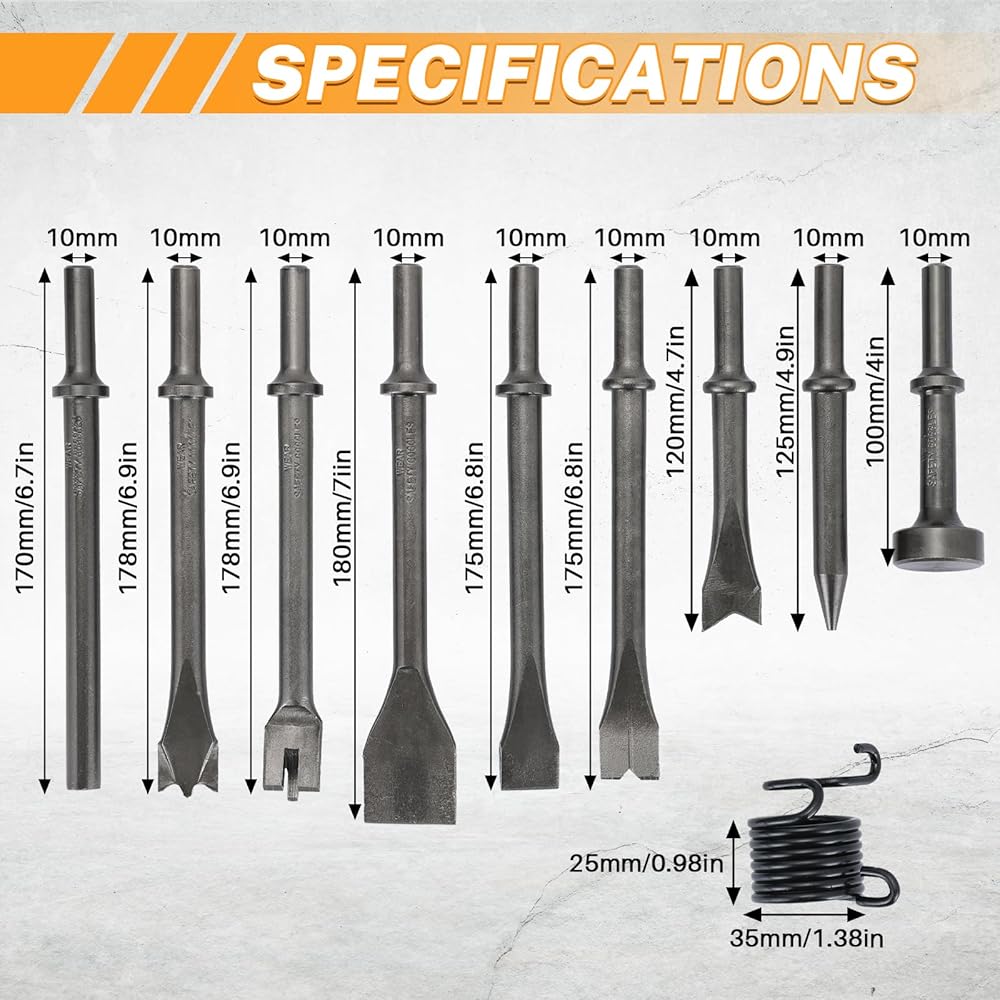 • مجموعة كاملة مكونة من 10 قطع: تتضمن لقم إزميل الهواء 9 أشكال مختلفة بالإضافة إلى زنبرك واحد، مما يوفر ملحقات متعددة الاستخدامات لمطارق إزميل الهواء، مثالية لإزالة المسامير والبناء وهدم الخرسانة وقطع المعادن وإزالة الصدأ.