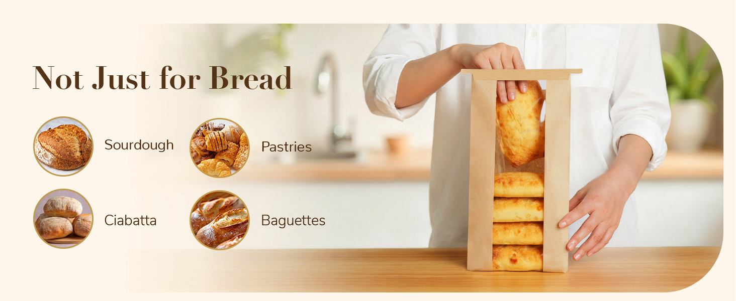 حجم مثالي للعجين البيضاوي: يبلغ مقاس أكياس الخبز هذه 16.3 سم طولًا × 6.3 سم عرضًا × 33.7 سم ارتفاعًا، ويمكن أن تناسب رغيف خبز العجين المخمر البيضاوي والخبز الفرنسي والشاباتا والمزيد من المعجنات.