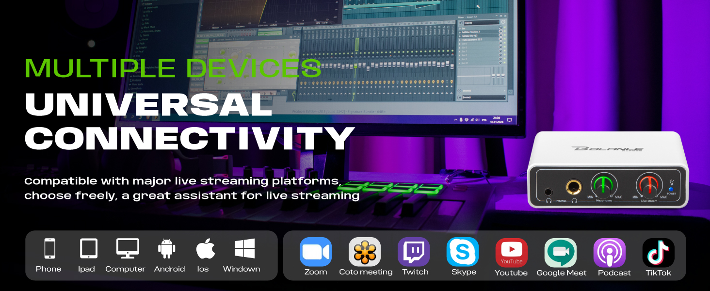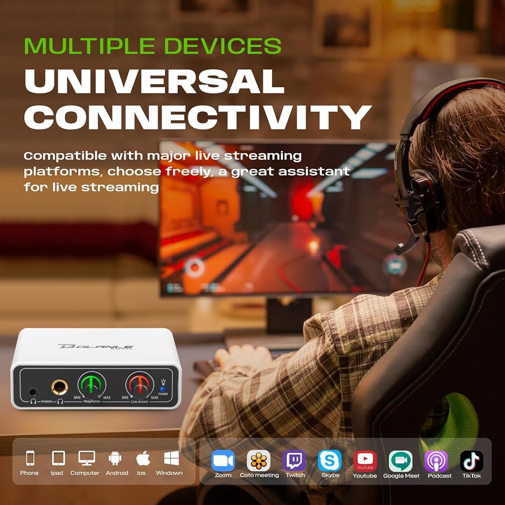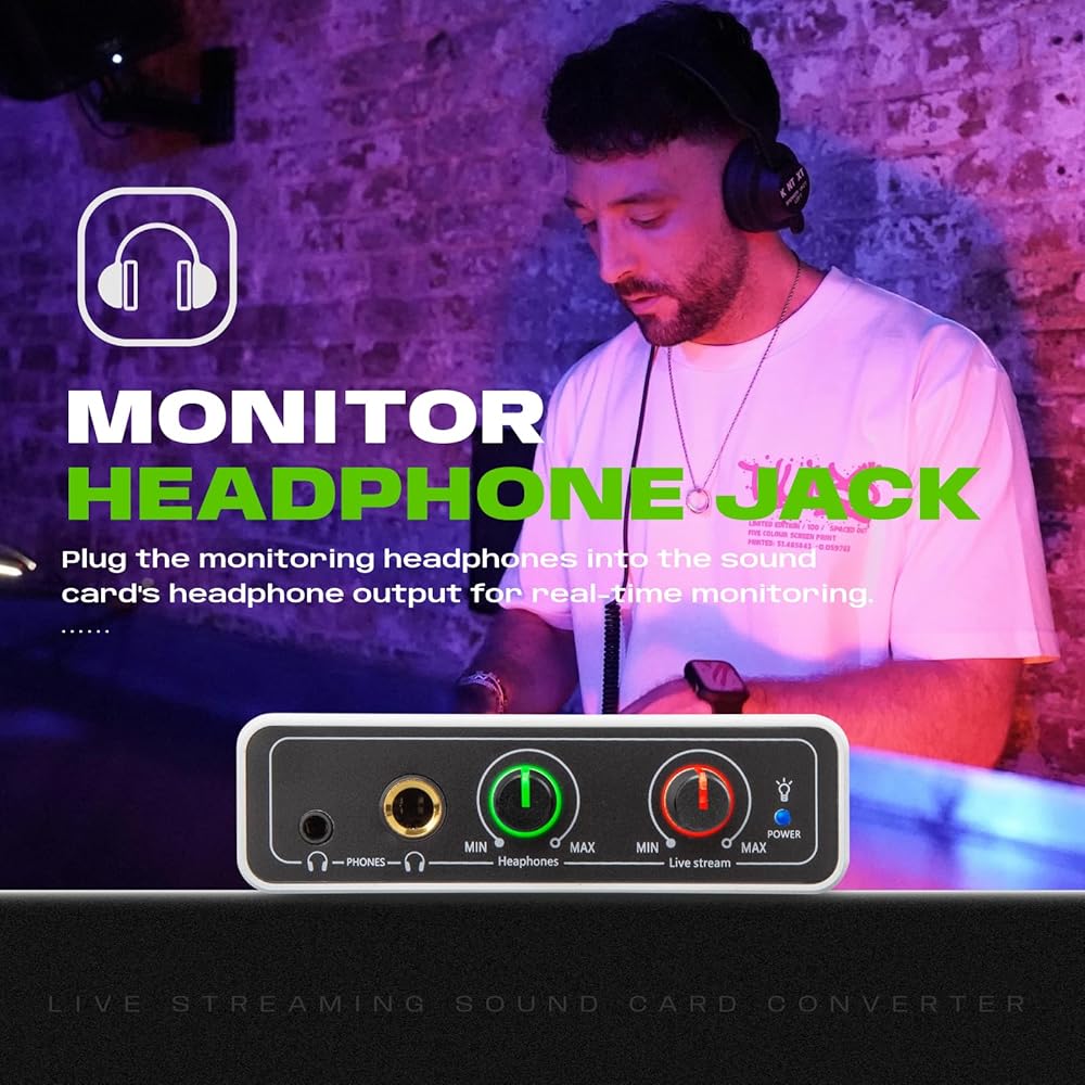 • 📱 قم بتحويل جهاز الصوت الاحترافي الخاص بك إلى إعداد بث مباشر على الهاتف المحمول: قم بتوصيل أي خلاط أو واجهة صوتية أو وحدة تحكم DJ بهاتفك للبث المباشر الاحترافي. يقبل مدخل AUX مقاس 3.5 ملم إخراج سماعة الرأس أو مستوى الخط من معداتك الحالية. يرسل مخرج USB-C OTG صوت استريو مباشرة إلى iPhone أو iPad أو Android لـ TikTok وYouTube وInstagram Live.